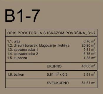 Stan B1-7 se nalazi se u zgradi B. Sastoji se od ulaza (6,76 m2), dnevnog boravka, blagavaonice i kuhinja (20,96 m2), kupaona (4,38 m2), dvije spavaće sobe (9,81 m2, 6,75 m2) i balkon (5,81 m2 - po obračunskom koeficijentu 2,91 m2).