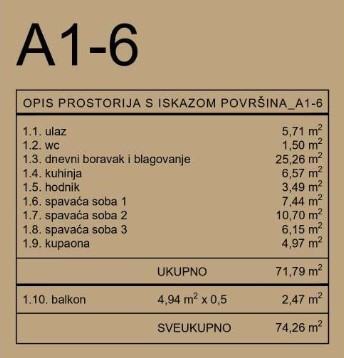 Stan A1-6 se nalazi se u zgradi A. Sastoji se od ulaza (5,71 m2), dnevnog boravka i blagavaonice (25,26 m2), kuhinje (6,57 m2), wc (1,50 m2), hodnik (3,49 m2), tri spavaće sobe (7,44 m2, 10,70 m2 i 6,15 m2), kupaonice (4,97 m2) i balkon (4,94 m2 - po obračunskom koeficijentu 2,47m2).