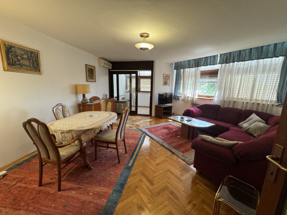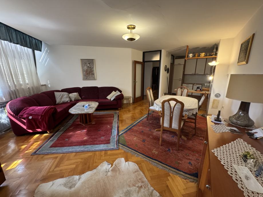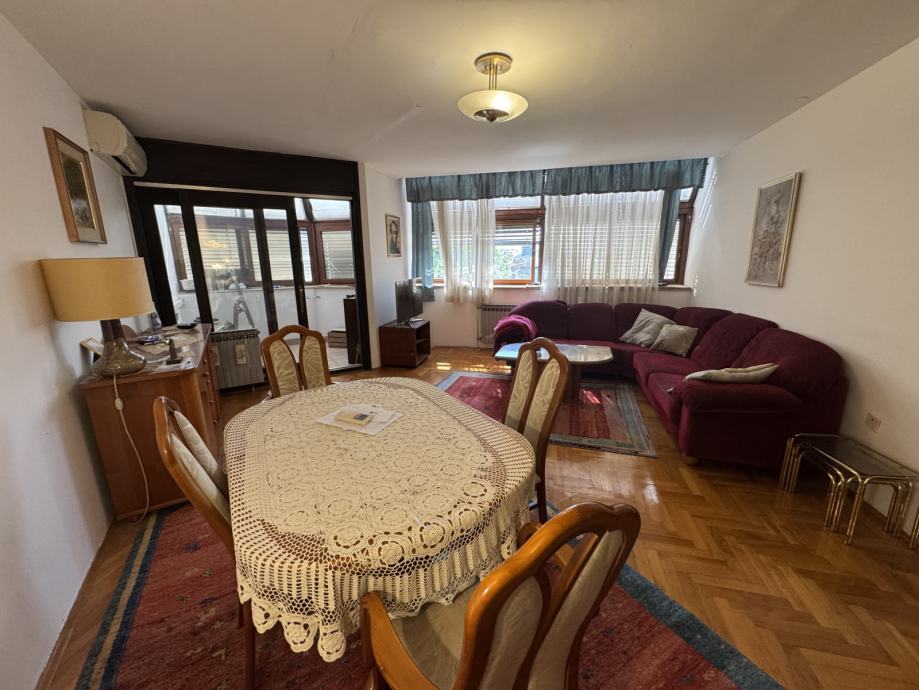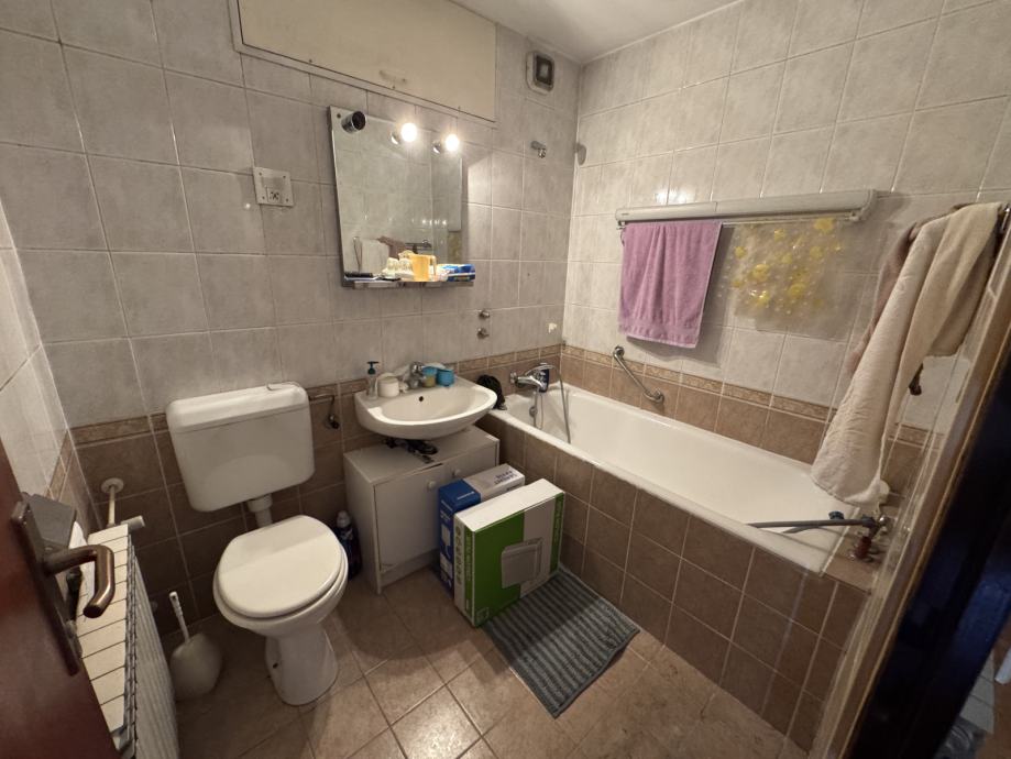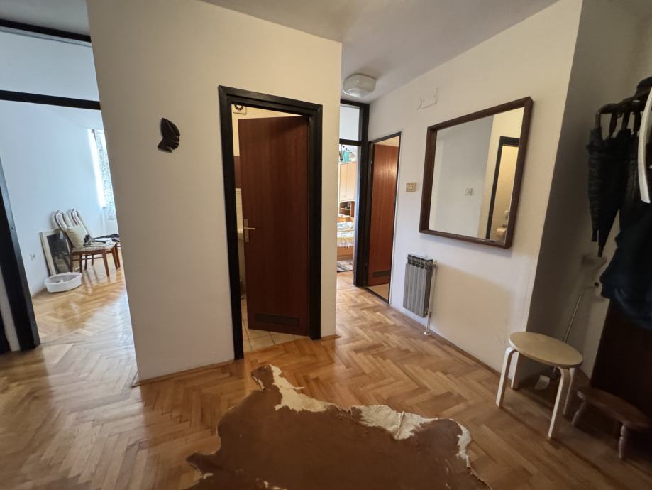 Stan se sastoji od prostranog hodnika / ulaza, ostave, kupaonice, wc, dvije spavaće sobe, kuhinje, dnevnog boravka i blagovaonice, lođe i spremište.