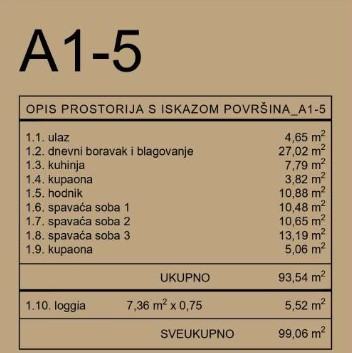 Stan A1-5 se nalazi se u zgradi A. Sastoji se od ulaza (4,65 m2), dnevnog boravka i blagavaonice (27,02 m2), kuhinje (7,79 m2), hodnika (10,88 m2), dvije kupaone (3,82 m2, 5,06 m2), tri spavaće sobe (10,48 m2, 10,65 m2, 13,19 m2) i loggie (7,36 m2 - po obračunskom koeficijentu 5,52 m2).