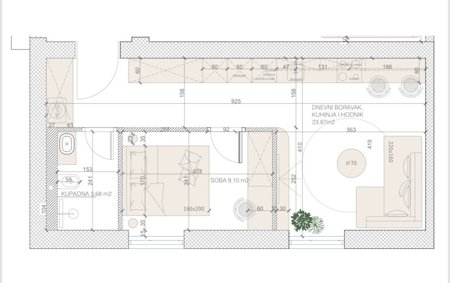 Stan se sastoji od ulaznog hodnika, kupaone, spavaće sobe i dnevnog boravka sa kuhinjom.