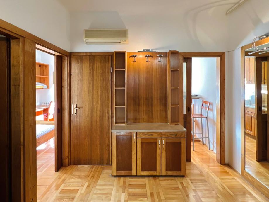 Hrastov parket (osim u kupaonici), 44 m2, orijentacija sjever - jug; 1 spavaća soba s balkonom i pogledom na vrt i zelenilo, veliki dnevni boravak, odvojena kuhinja, kupaonica + wc, hodnik, ostava/ugradbeni ormar.