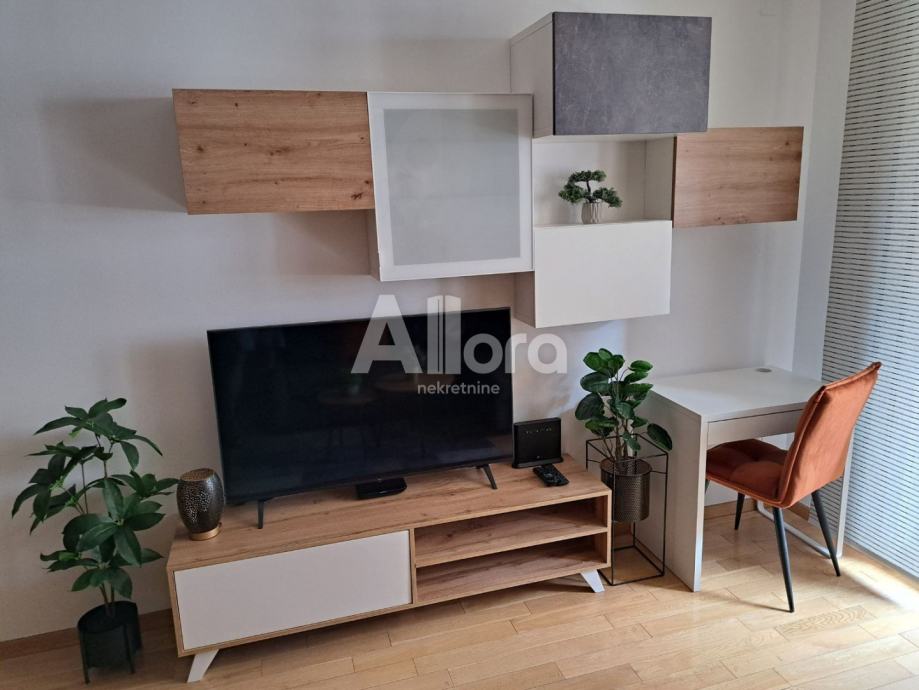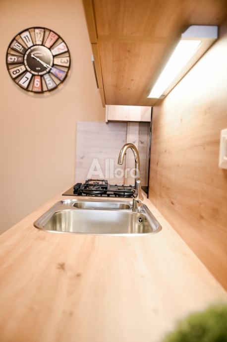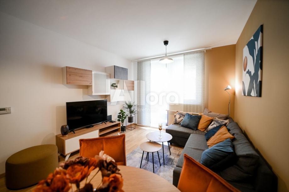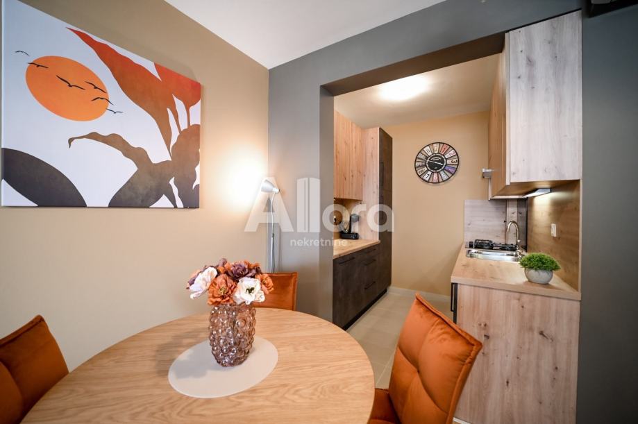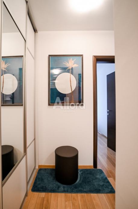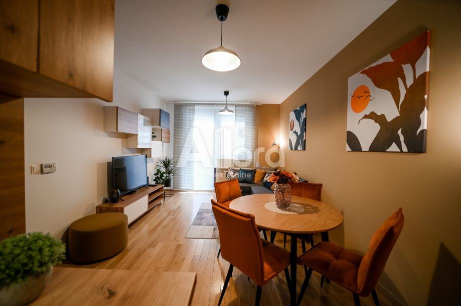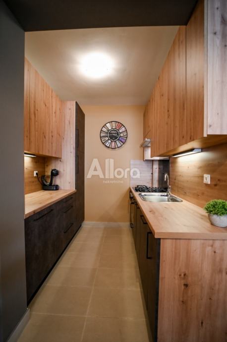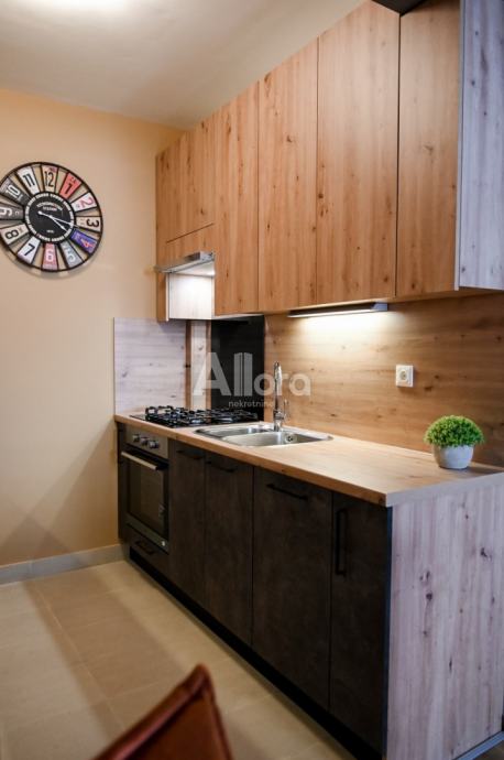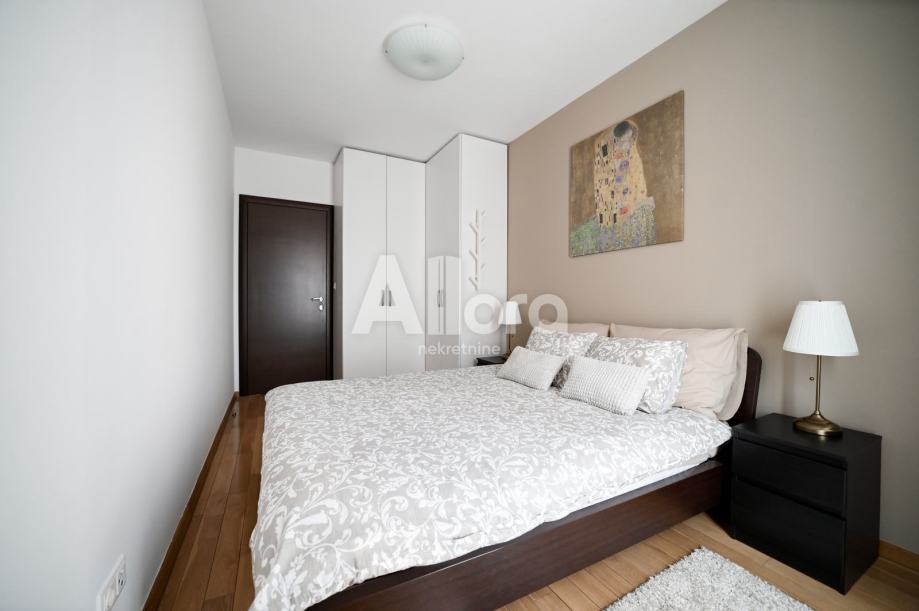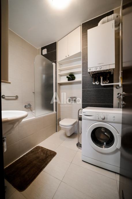 Stan je u potpunosti opremljen - komplet nova kuhinja (pećnica, ploča za kuhanje, napa, mikrovalna pećnica, perilica suđa, frižider), stol i stolice, TV, klima, sofa, bračni krevet, ormari, vješalice, noćni ormarići, protuprovalna vrata, veš mašina, daska za peglanje, pegla, fen, balkon sa stolom i stolicama, komplet sav potreban namještaj.
