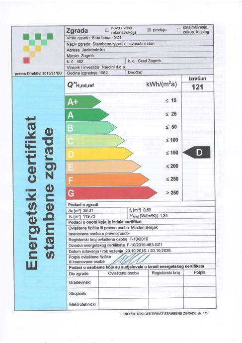 PRVI KAT od četiri - ENERGETSKI CERTIFIKAT (razred “C”)