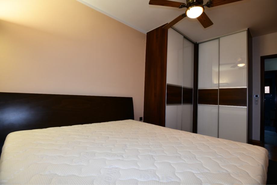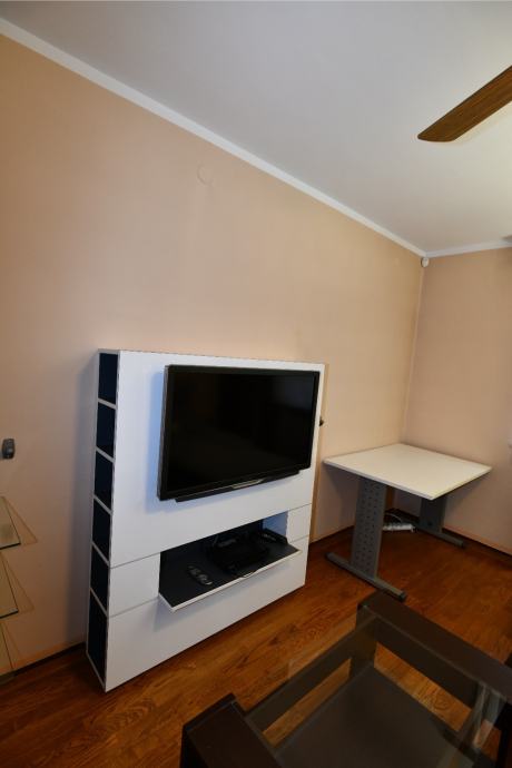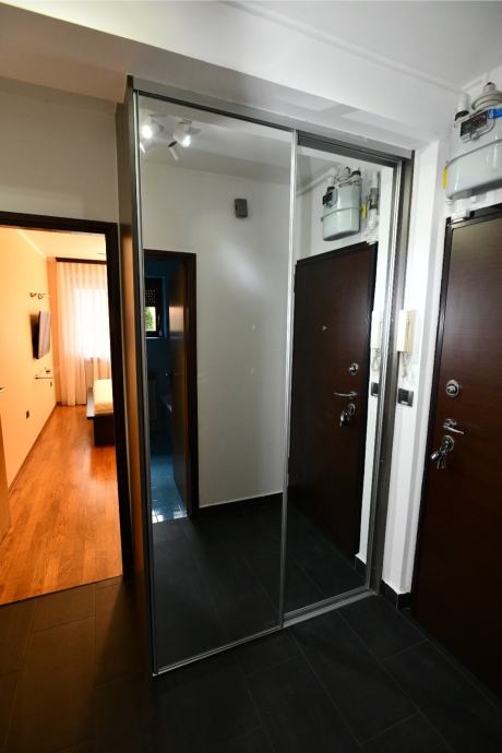 Uređen i namješten dvosoban stan od 55 m2, na prvom katu stambene zgrade. Sastoji se od ulaznog prostora s ugradbenim ormarom marke Eduro, kuhinje, dnevnog boravka s ugradbenim ormarima marke Eduro, spavaće sobe s ugradbenim ormarom marke Eduro. Stan ima protuprovalna vrata, alarmni sustav, nadzorne kamere, optički internet, telefonsku liniju, novi klima uređaj marke Daikin, etažno grijanje, novo uređenu kuhinju sa svim vrhunskim kućanskim aparatima marke Bosch. Parkiranje je moguće oko zgrade.