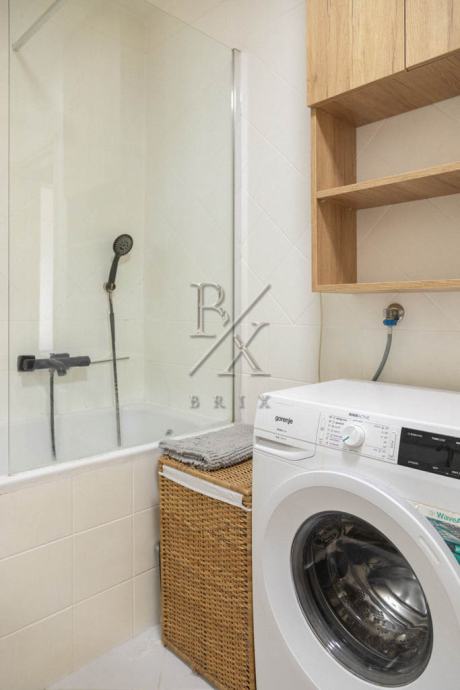 Stan je potpuno opremljen novom bijelom tehnikom: perilica posuđa, perilica rublja, pećnica s kuhalom, ugradbeni hladnjak i zamrzivač, klima uređaji u spavaćoj i dnevnoj sobi, te veliki televizor.