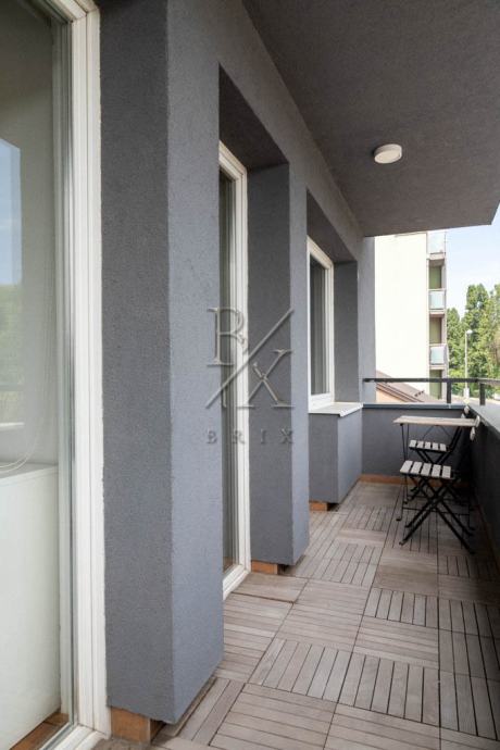Stan ima prostrani balkon s izlazima iz dnevne i spavaće sobe te otvoreni pogled na zeleni park. Uz stan dolazi mogućnost korištenja besplatnog parkinga unutar kruga zgrade.