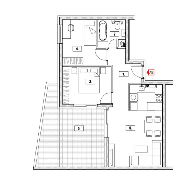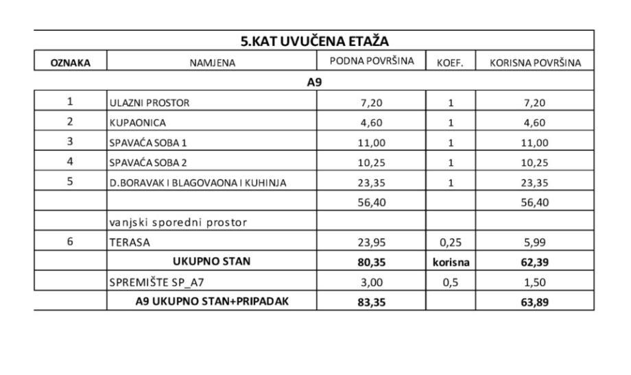 Uz stan A9 je unutar cijene uključeno spremište (ukupna neto prodajna površina 63,89 m2).