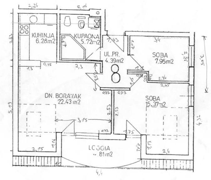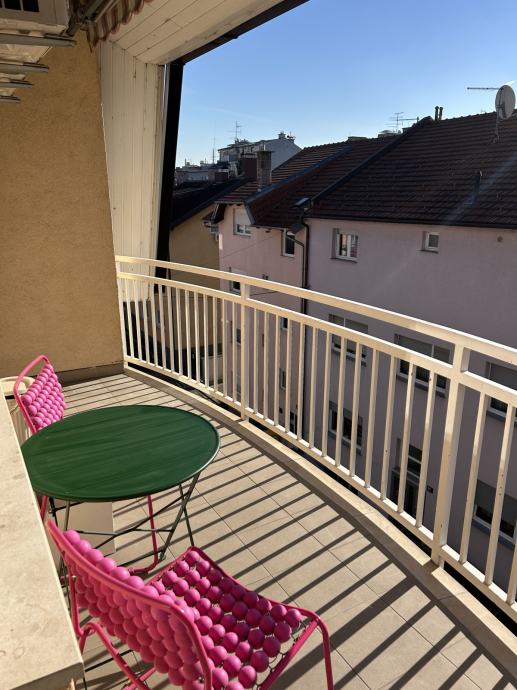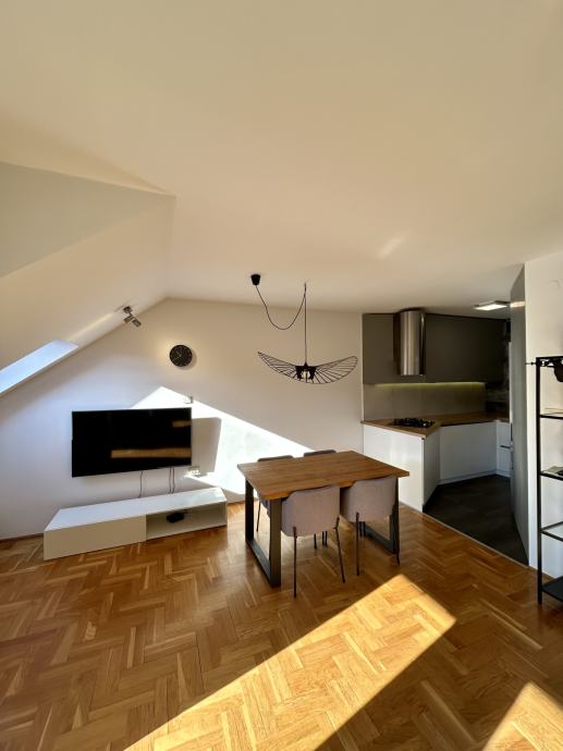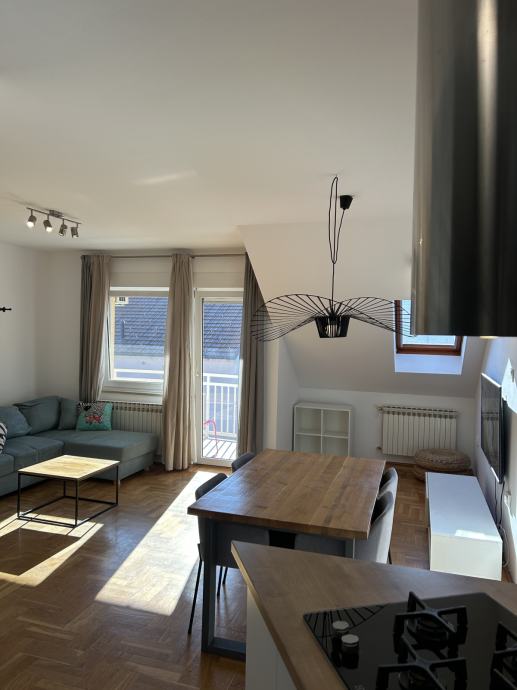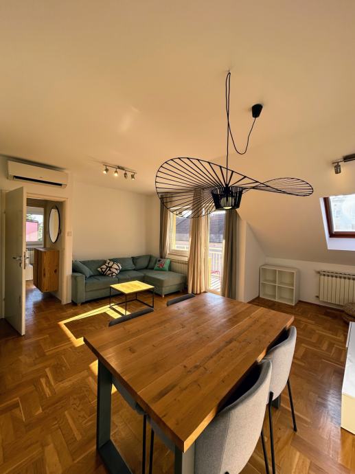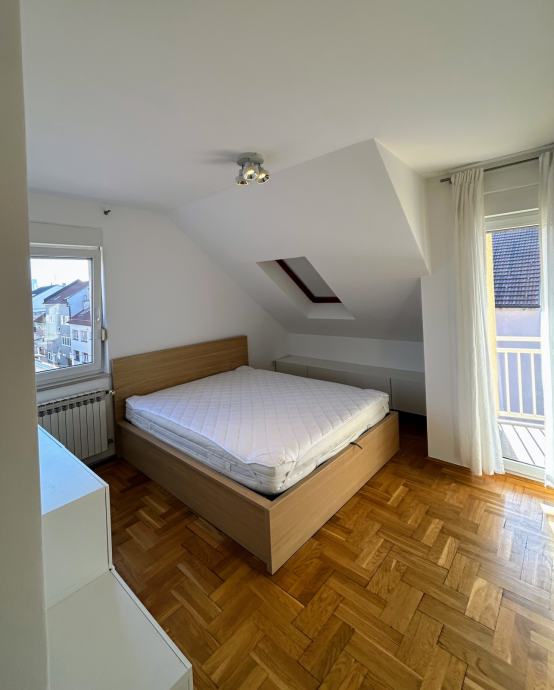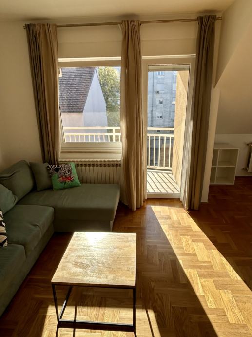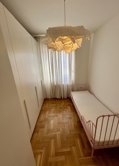 Iznajmljuje se trosoban namješten stan stvarne korisne površine 62.14 m2 na trećem katu manje zgrade bez lifta, na izvrsnoj lokaciji, u mirnoj jednosmjernoj ulici. Stanu pripada i loggia površine 4.81 m2 te spremište površine 2.64 m2.