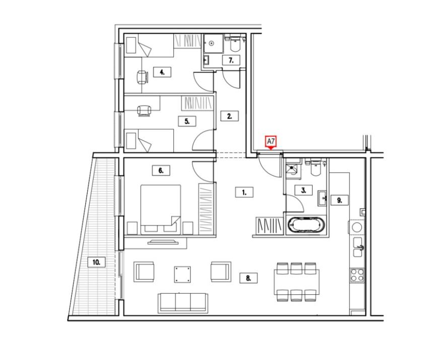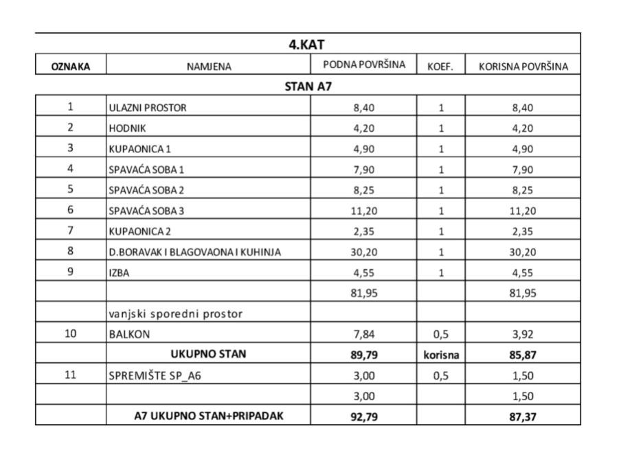 Uz stan A7 je unutar cijene uključeno spremište (ukupna neto prodajna površina 87,37 m2).