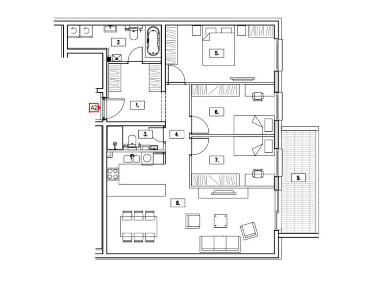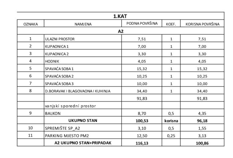Uz stan A2 je unutar cijene uključeno spremište te parkirno mjesto (ukupna neto prodajna površina 100,86 m2).