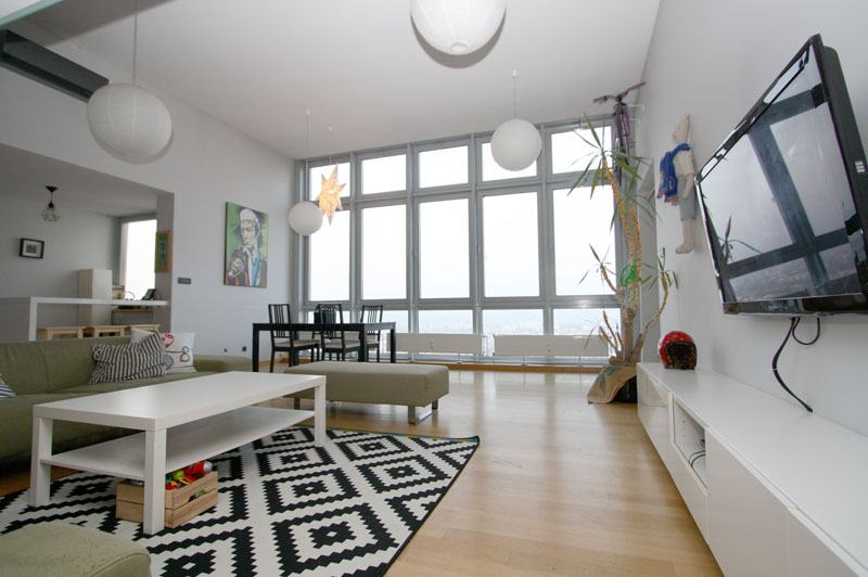 Adaptirani (sve nove instalacije (struja, voda, elektro...), novi radijatori, parketi, keramika...) penthouse na 22. katu nebodera iz 1971 g. sa spektakularnim pogledom. Čine ga 2 spavaće sobe (10 i 11 m2), garderoba (7 m2), galerija/spavaća soba/radna soba (15 m2), dnevni boravak (50 m2), namještena kuhinja (5 m2), blagovaona (8 m2), kupaona s 'walk-in' tušem (7 m2), toalet (1,5 m2) i zatvorena lođa (11 m2). Parkiralište se nalazi ispred zgrade i rezervirano je samo za stanare. Visina stropa u dnevnom boravku 4 m, staklena stijena u dnevnom boravku 6 x 4 m, orijentacija stana sjever-zapad, hrastov parket I klasa, protuprovalna vrata, 'stolarija' Schucco, neposredna blizina tramvaja. Mogućnost organizacije prostora po želji, dogradnje još jedne spavaće sobe...