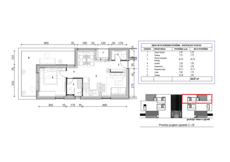 Zgrada B i C je dvojna građevina po 3 stana i imaju kolni i pješački pristup sa sjeverne strane iz ulice V. Trokut. Građevine su katnosti P + 1k + Pk. Na etaži prizemlja, 1. kata i uvučenog kata nalaze se po 2 stana. Ukupno 6 stanova. Vanjska parkirna mjesta nalaze se na razini prizemlja sa sjeverne, zapadne i istočne strane. Na parkirnim mjestima je priprema za punjenje električnih vozila.