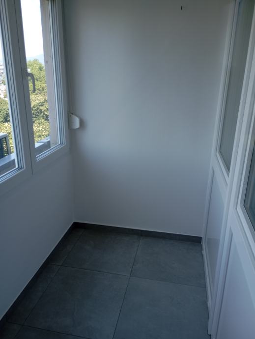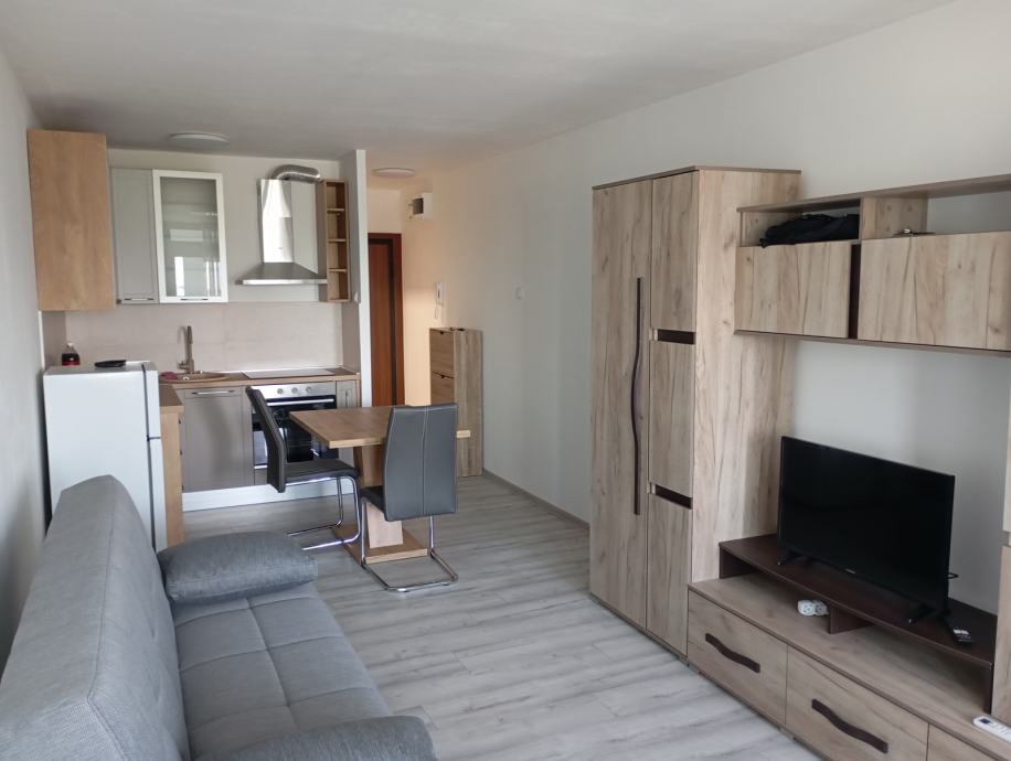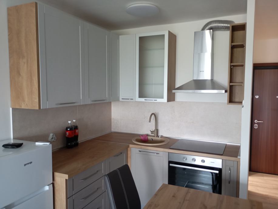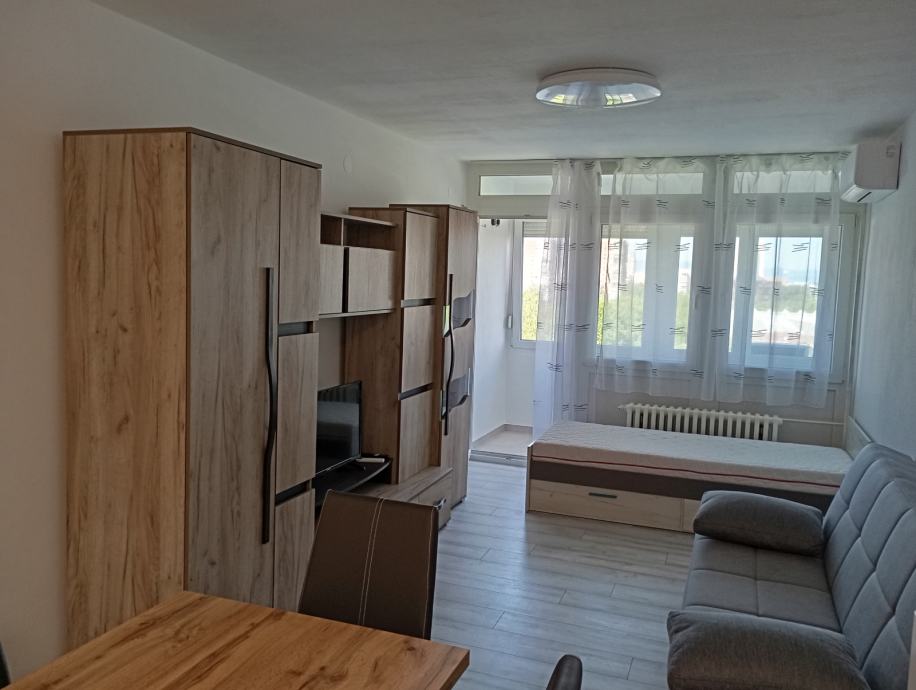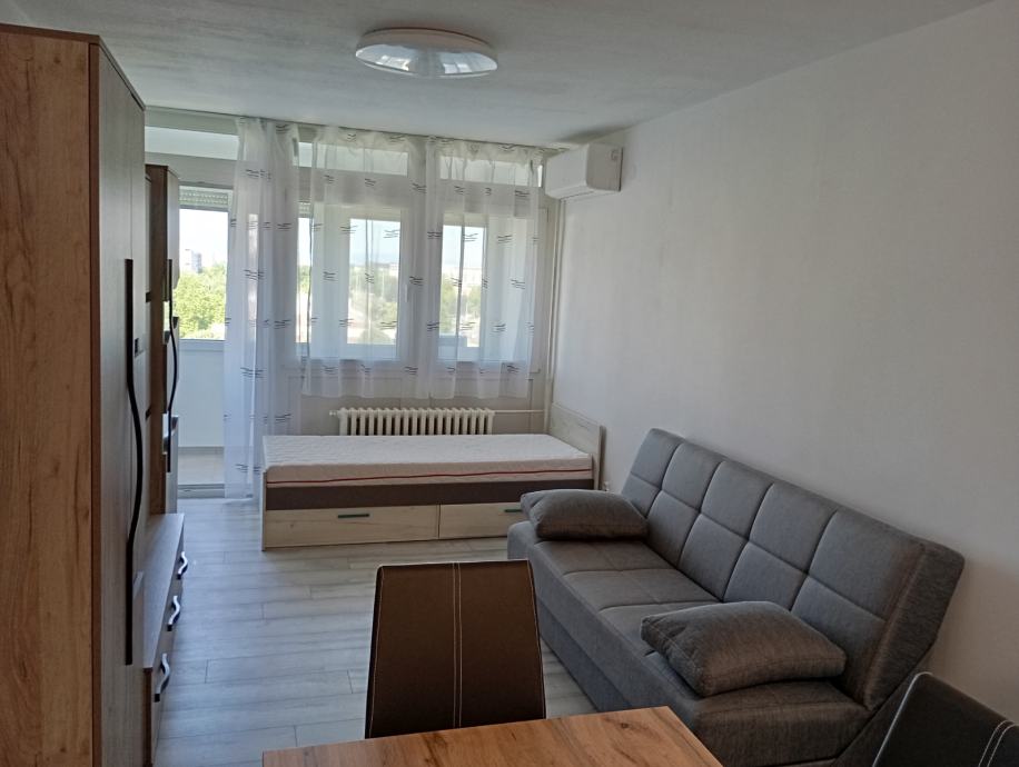 Iznajmljuje se namještena garsonjera veličine 30 m2. Sastoji se od kupaonice, dnevne sobe s kuhinjom i zatvorene loggie. Stan je opremljen klima uređajem, perilicom rublja, android TV-om a u kuhinji su ugradbena ploča, pečnica, frižider sa zamrzivačem i napa. Garsonjera se nalazi na sedmom katu zgrade (od 9) koja ima tri lifta od toga jedan je teretni a sama zgrada se nalazi odmah do tržnice Utrine na adresi Hrastin prilaz 3. Ugrađena su protuprovalna vrata.