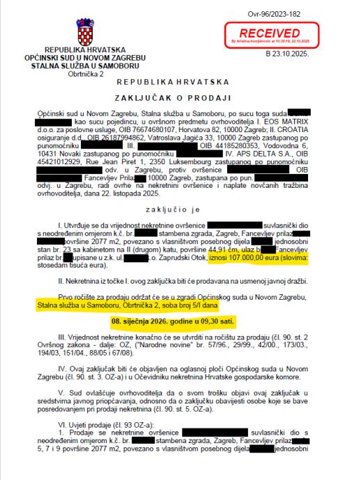 Novi termin dražbe: 08. siječnja 2026. godine u 09,30 sati.