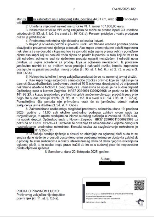 - Kao kupci mogu sudjelovati samo osobe (fizičke i pravne) koje su najkasnije na dan ročišta za dražbu dale jamčevinu u visini od 10 % (slovima: deset posto) od vrijednosti nekretnine utvrđene točkom I. ovog zaključka. Jamčevina se uplaćuje na sudski depozit Općinskog suda u Novom Zagrebu HR37 23900011300029968 uz poziv na br. HR00 101-96-23, a kupac je potvrdu o prethodnoj uplati jamčevine obvezan predočiti sucu prije nego što sudac pristupi dražbi.
