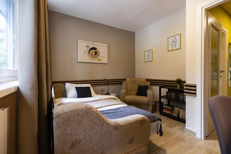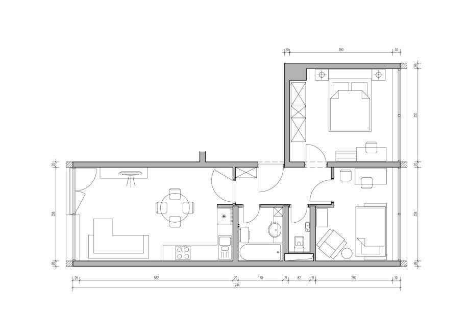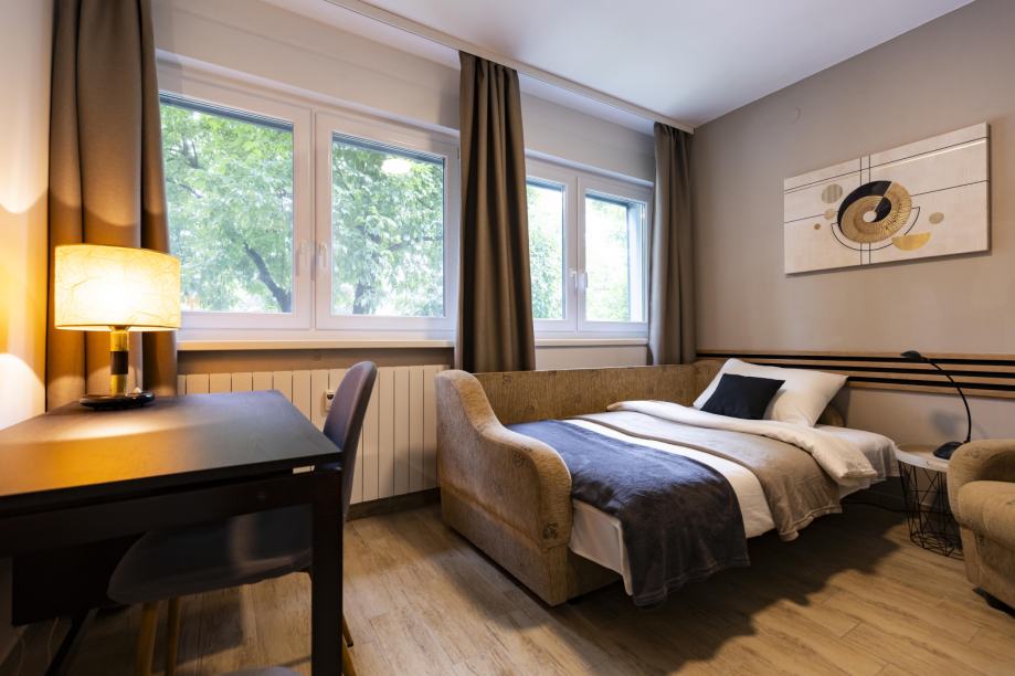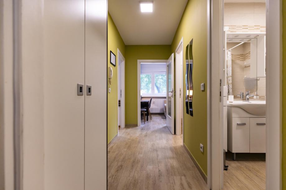 Stan se sastoji od ulaznog hodnika, kupaonice, wc-a, dvije spavaće sobe i dnevnog boravka s kuhinjom. Sobe su orijentirane na sjever a dnevni boravak s kuhinjom na jug.