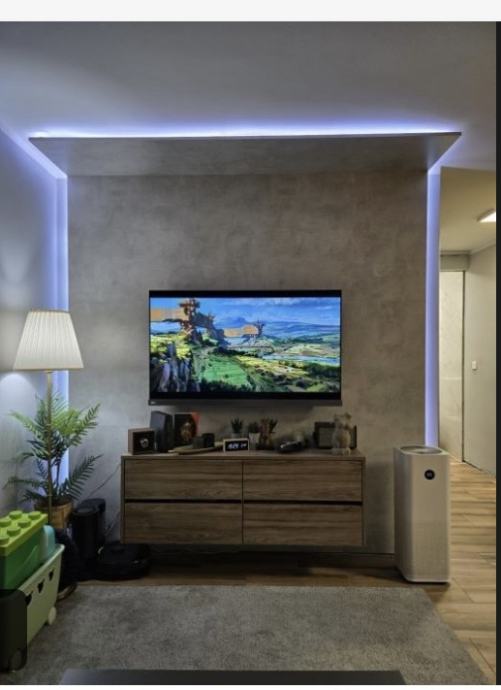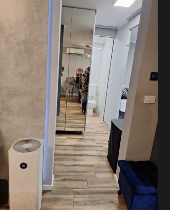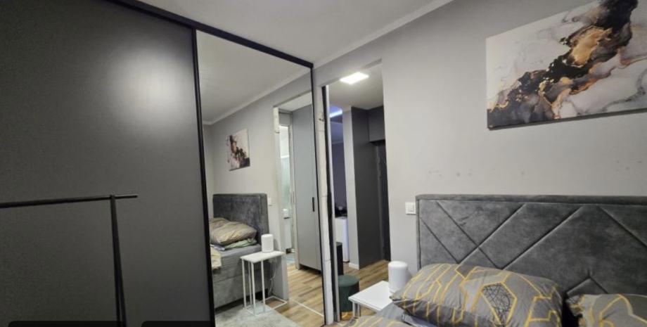 Stan se sastoji od hodnika- i male ostave u hodniku s velikim ugradbenim ormarem,velike dnevne sobe s kuhinjom, kupaone s wc-om i male sobe u kojem je bracni krevet i veliki ugradbeni ormar