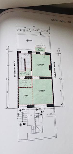1. kat: boravak sa kuhinjom i blagovaonicom, spavaća soba sa izlazom na balkon, kupaonica i hodnik.