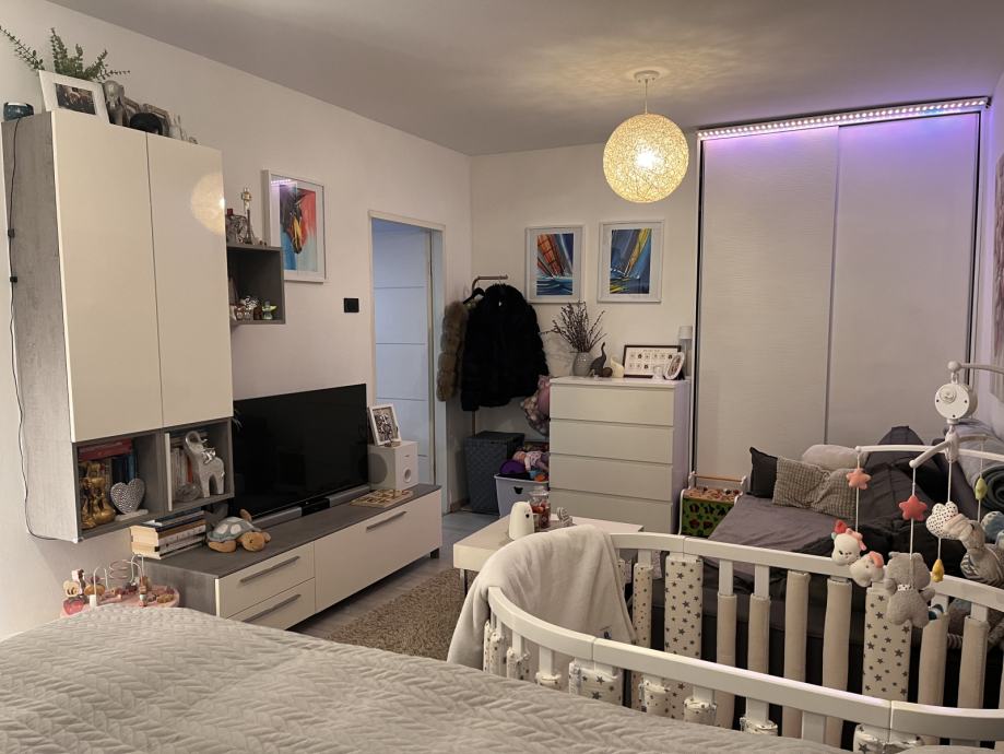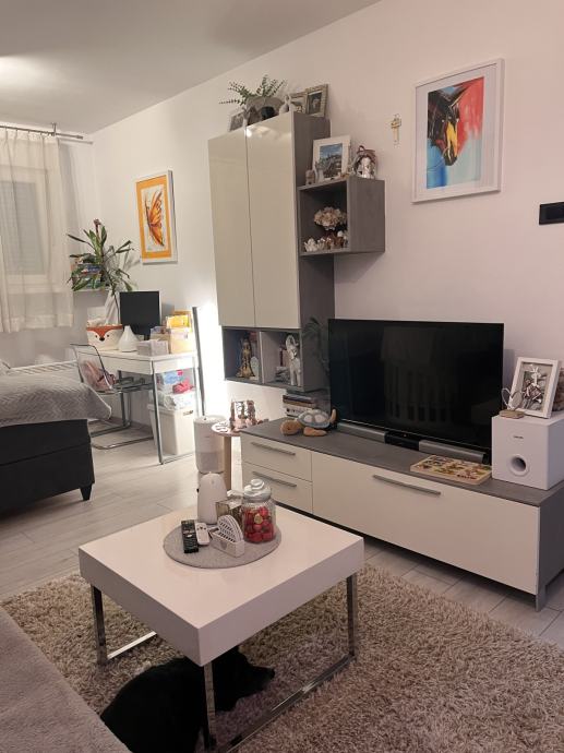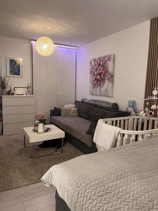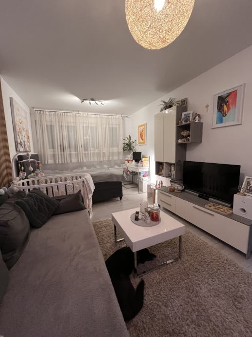 Stan se prodaje djelomično namješten ( ostaje kuhinja sa aparatima, trosjed, ugradbeni ormar i komoda u blagavaonici).