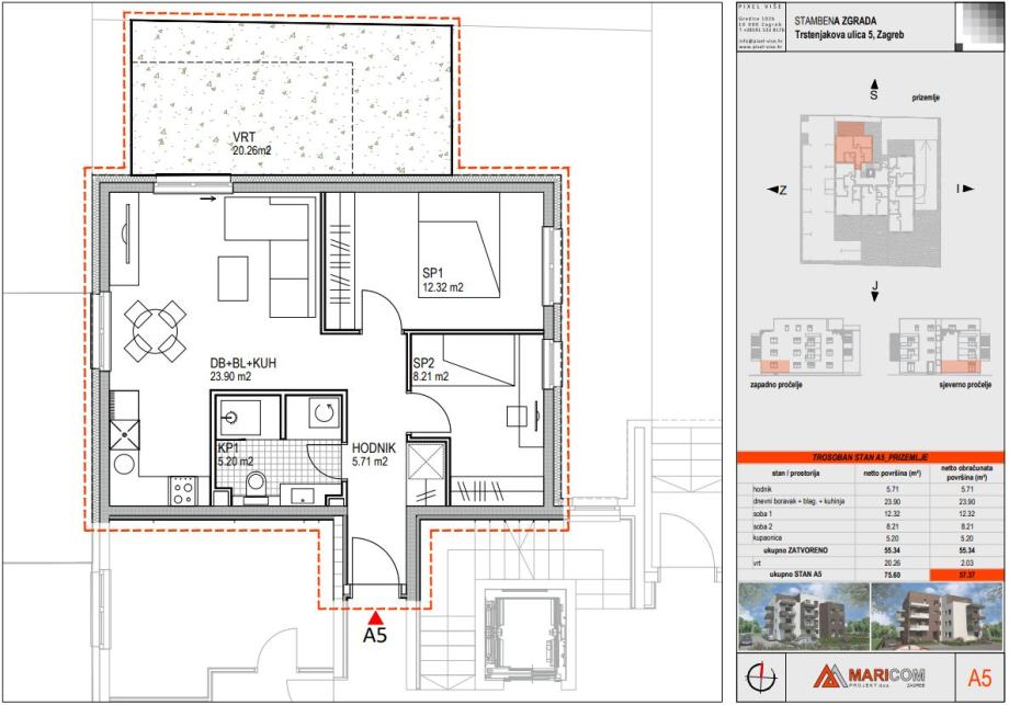 Trosobni stan A5 nalazi se u prizemlju projekta Trstenjakova 5, Zagreb.