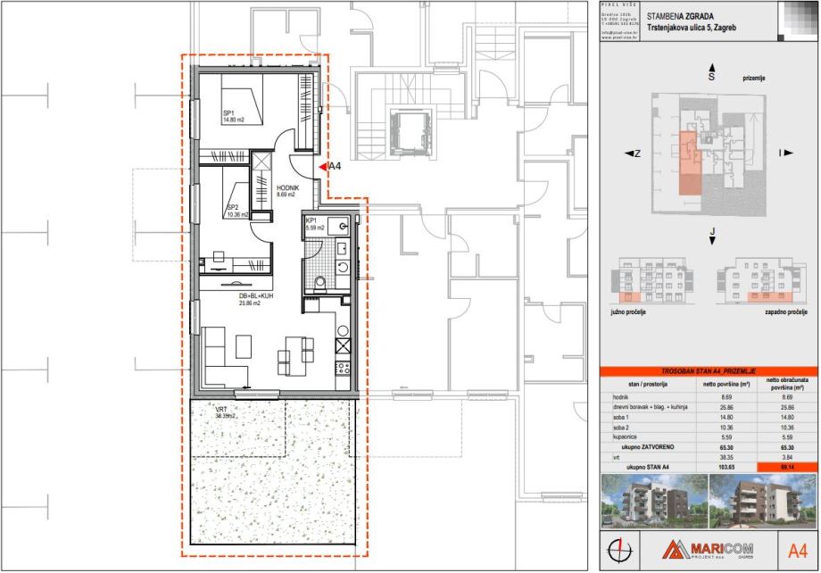 Trosobni stan A4 nalazi se u prizemlju projekta Trstenjakova 5, Zagreb.