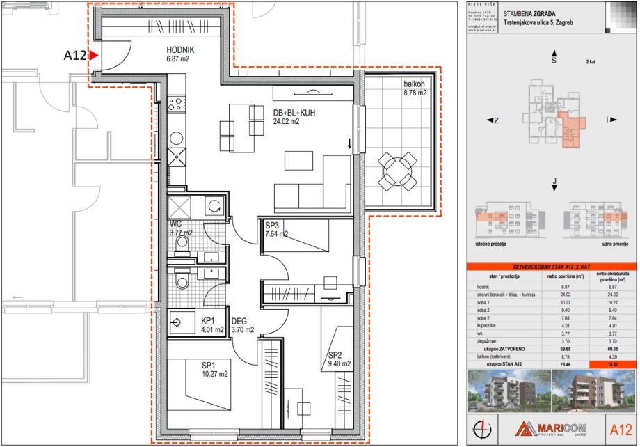 Četverosobni stan A12 nalazi se na drugom katu projekta Trstenjakova 5, Zagreb.