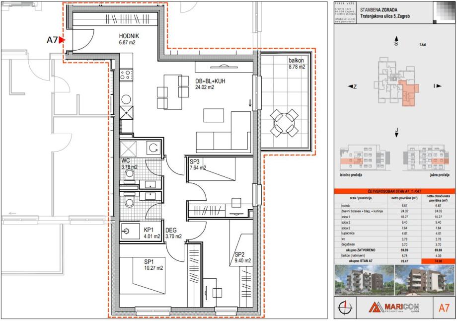 Četverosobni stan A7 nalazi se na prvom katu projekta Trstenjakova 5, Zagreb.
