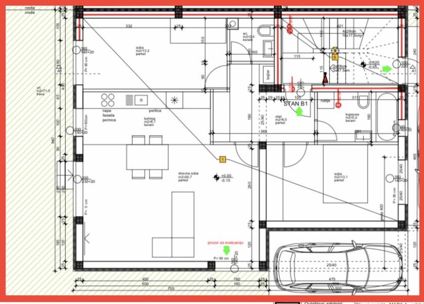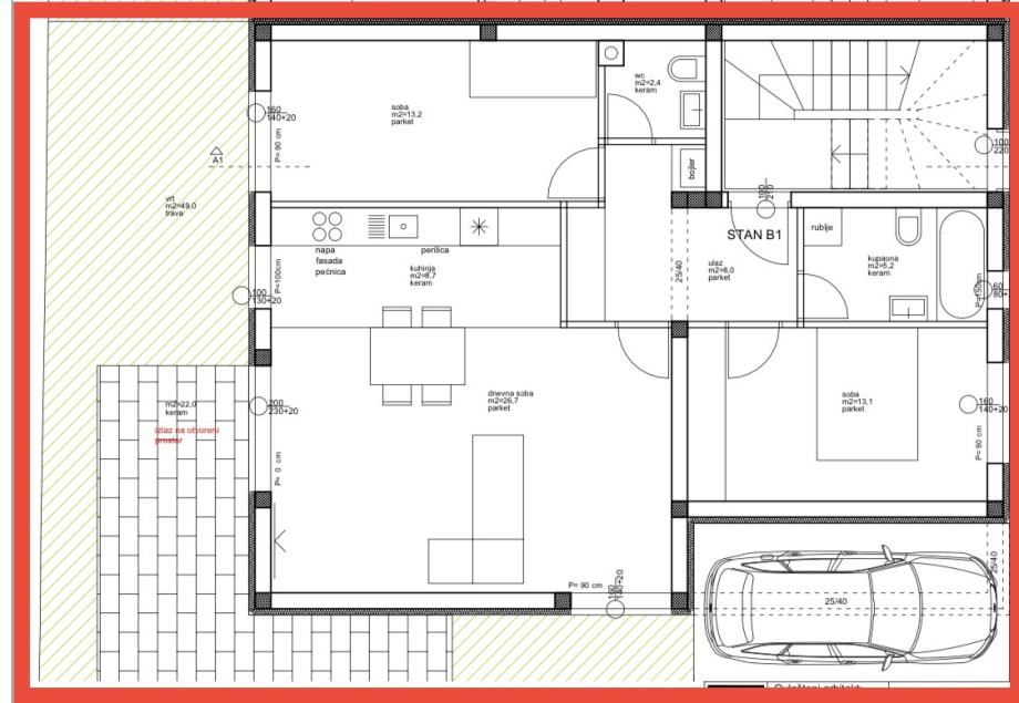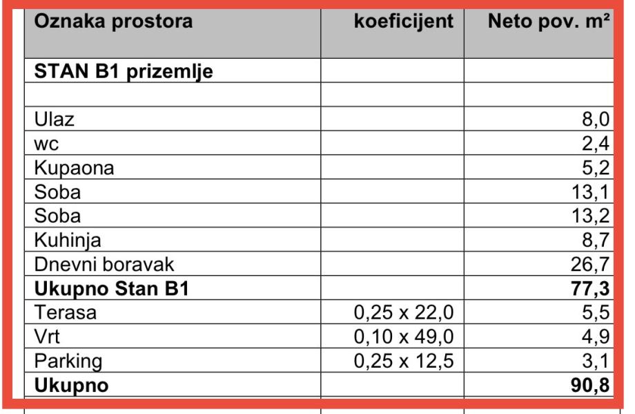 STAN br.1 u visokom prizemlju ima upotrebljivu zatvorenu površinu stana 77m2 te veliku vrtnu zelenu površinu s lijeve strane i iza s izlazom s terase ukupno 49,00 m2 na koju se nadovezuje parkirno mjesto 12,5m2 te sve osigurava kompletno privatnu lijevu stranu zgrade sa vlastitim pristupom parkingu i vrtnoj terasi.