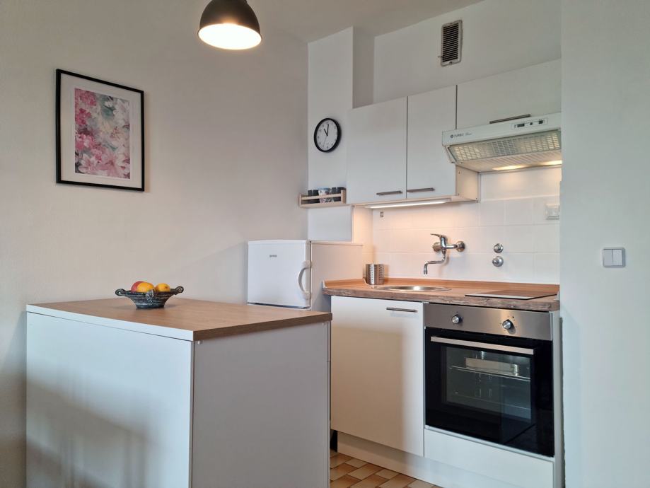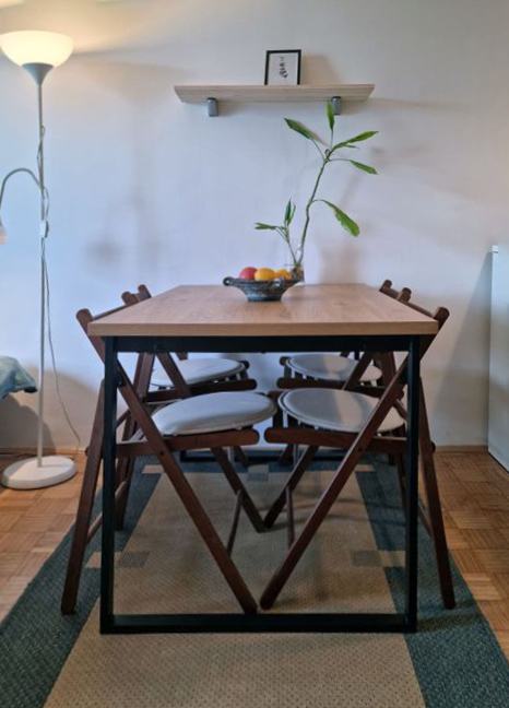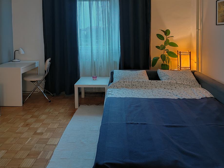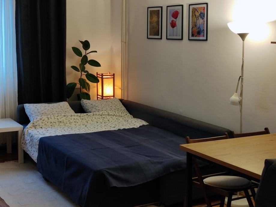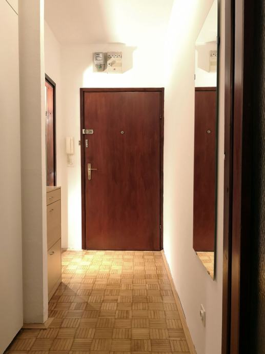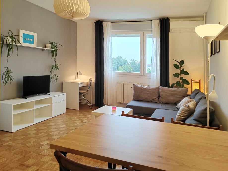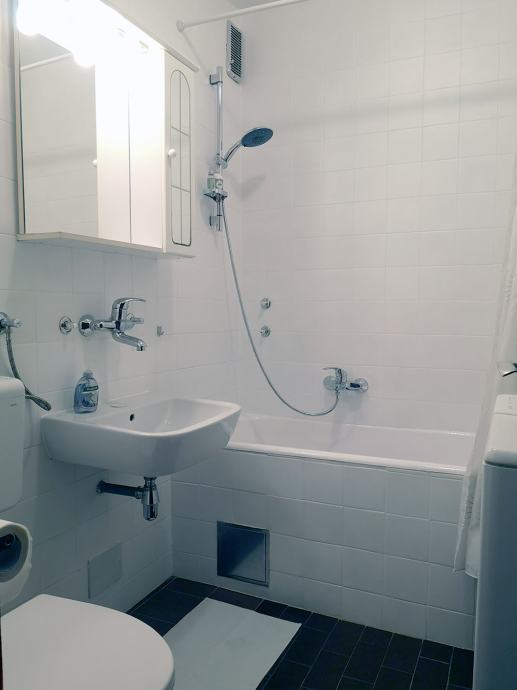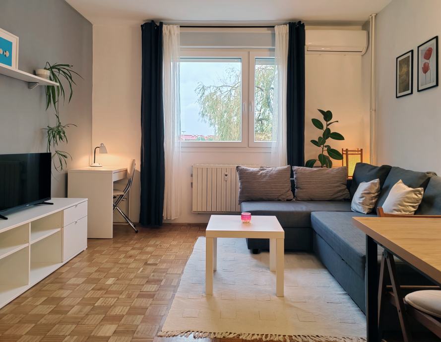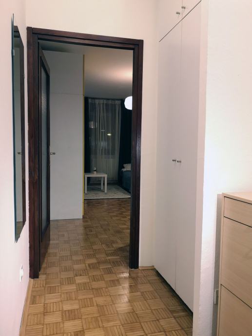 Stan na trećem katu. Sadrži: klima uređaj, TV, kuhinjske aparate (indukcijska ploča, hladnjak, pećnica, napa), perilicu rublja.