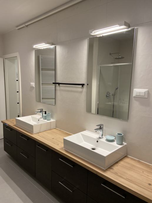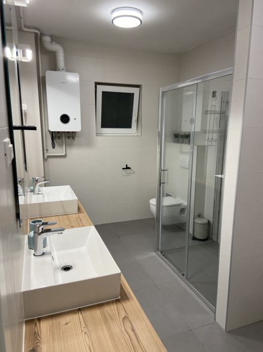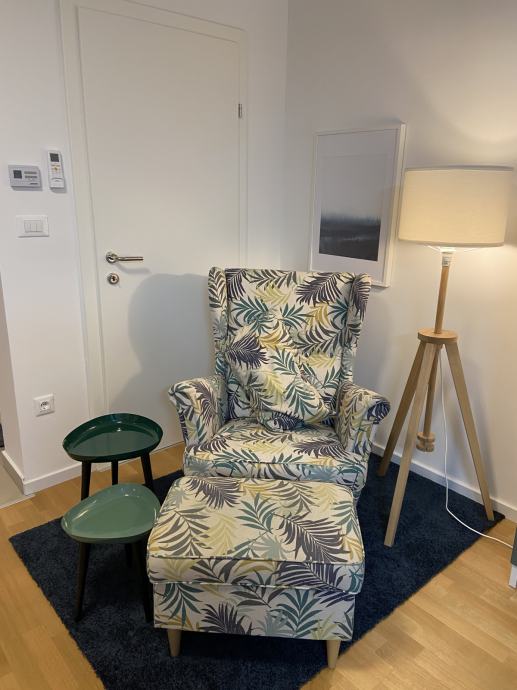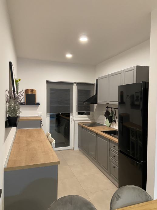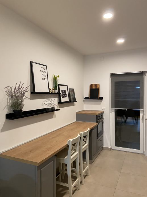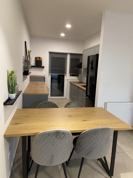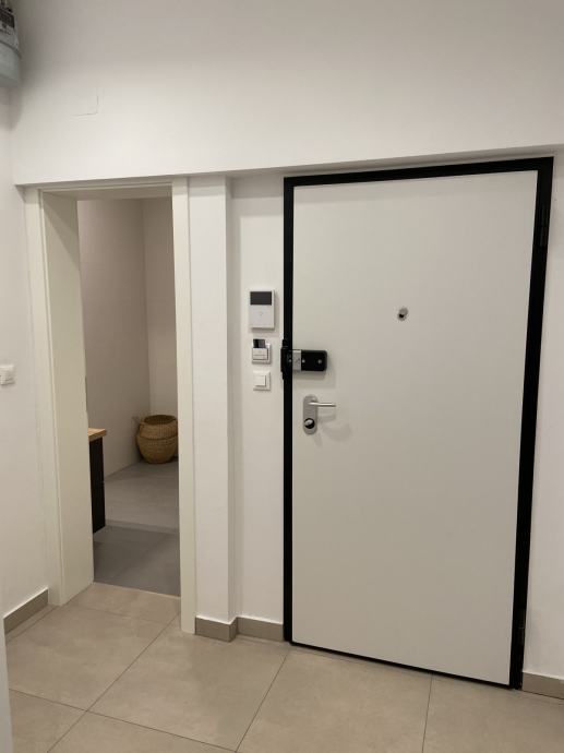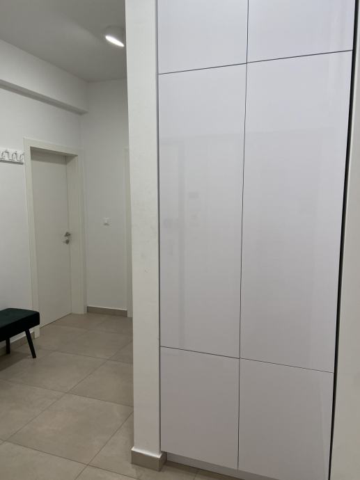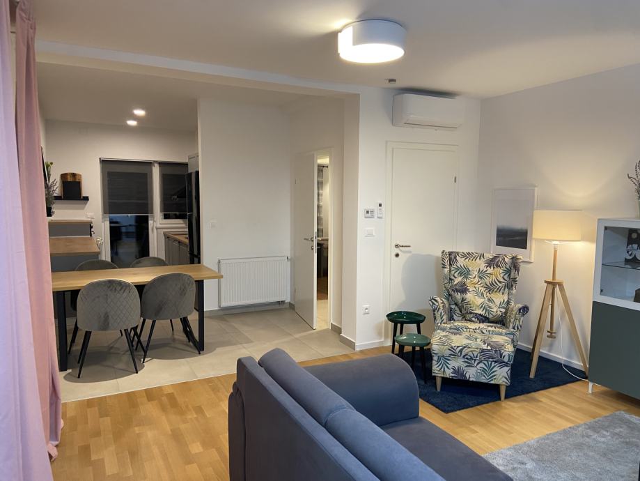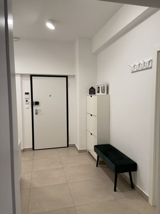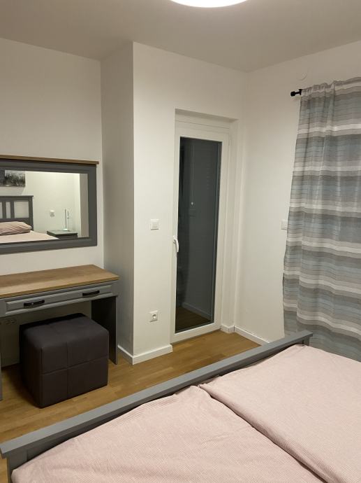 Stan ima 65m2 i sastoji se od dnevnog boravaka s kuhinjom i blagovaonom, spavaća soba i kupaonica, te dva balkona. Stan je u potpunosti opremljen (protuprovalna ulazna vrata plus elektronska brava na šifru, rolete-električno upravljanje, walk in tuš, perilica posuđa, perilica rublja, indukcijska ploča, pećnica, posuđe, klima uređaj u dnevnom boravku te zasebno u spavaćoj sobi...). Centralno etažno grijanje na plin. Svi stanovi imaju svoja vlastita mjerila. Javni parking bez naplate.