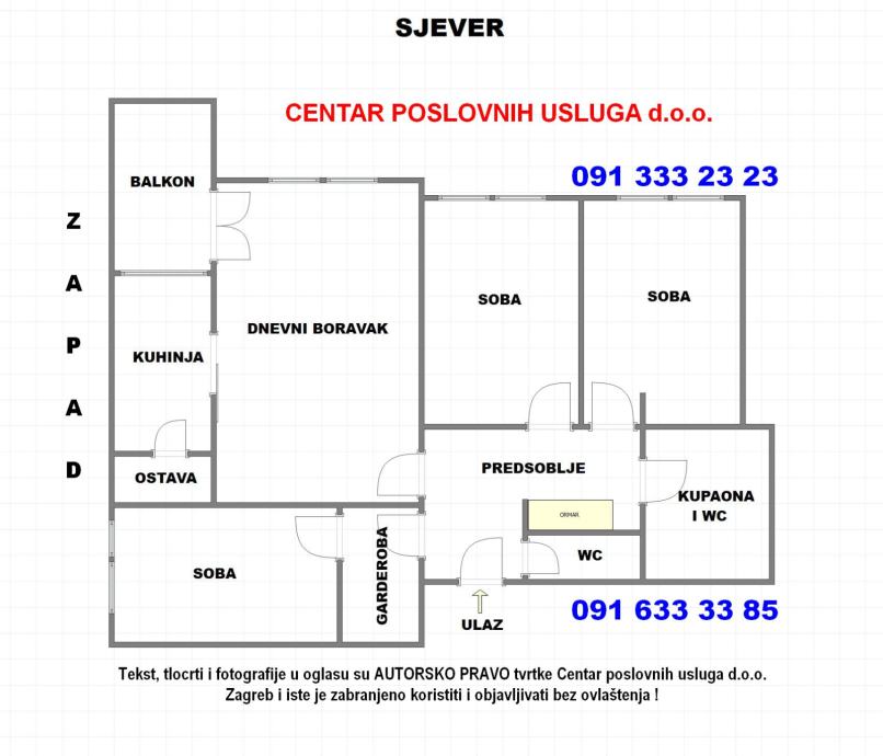 Tekst, tlocrti i fotografije u oglasu su AUTORSKO PRAVO tvrtke Centar poslovnih usluga d.o.o. Zagreb i iste je zabranjeno koristiti i objavljivati bez ovlaštenja !!!