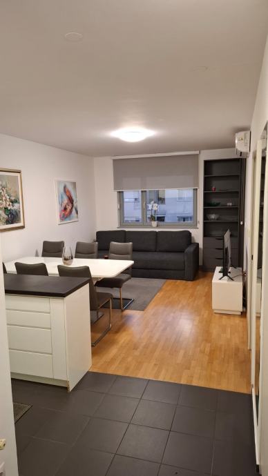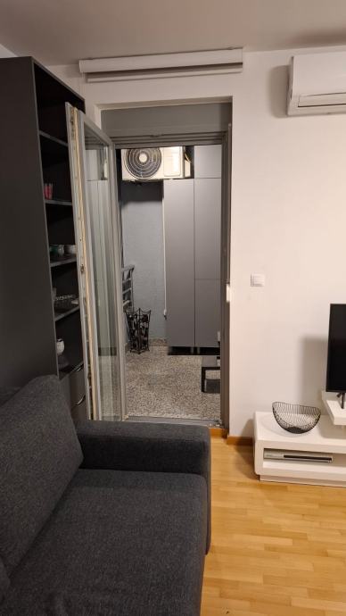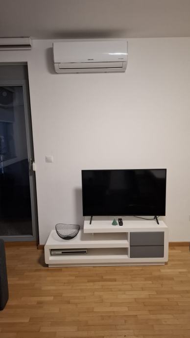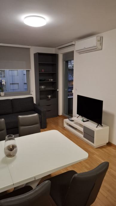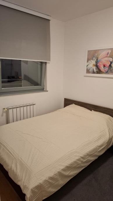 Stan se sastoji od dnevnog boravka sa kuhinjom, ostave, kupaonice, spavaće sobe i logge. Stan je kompletno namješten (suđe, novi ručnici, posteljina, parna postaja, daska za peglanje, usisavač, perilica suđa, perilica veša, 2x tv, ugradbeni ormari, klima). Etažno plinsko grijanje, male režije. Provedena optika. Obavezna prijava kao i plaćenje pologa (jedne mjesečne najamnine, koja se vraća). Dugoročni najam. Parking ispred zgrade koji se ne plaća.