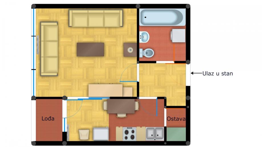 Iznajmljuje se jednosoban stan površine 38 m2 na 3. katu stambene zgrade u Rujanskoj ulici koji se sastoji od predsoblja, sobe, kuhinje, ostave, kupaonice i lođe. Stan ima podrum i parkirno mjesto oko zgrade. Stan je u potpunosti namješten, grijanje je preko toplane i opremljen je aparatima (hladnjak, štednjak, perilica rublja, usisavač). Javnim prijevozom je povezan s ostatkom grada tramvajskim linijama 5 i 17 te autobusom preko Ljubljanice koja je udaljena 2 stanice odakle voze tramvajske linije 3, 9 i 12. U blizini stana se nalazi osnovna škola, vrtić, dom zdravlja, ljekarna, Konzum, Getro, McDonalds. Jarunsko jezero je udaljeno oko 1 kilometar.