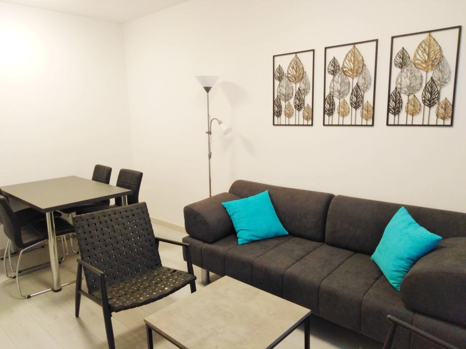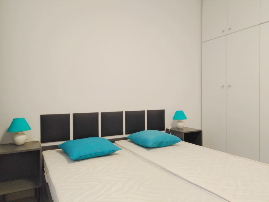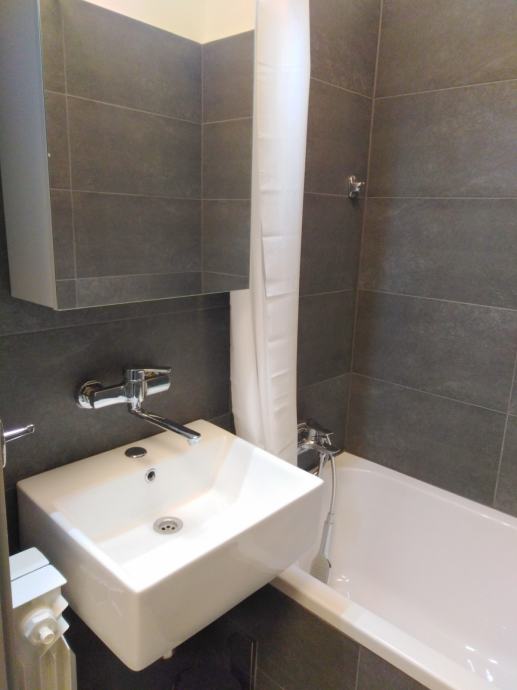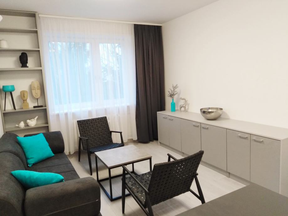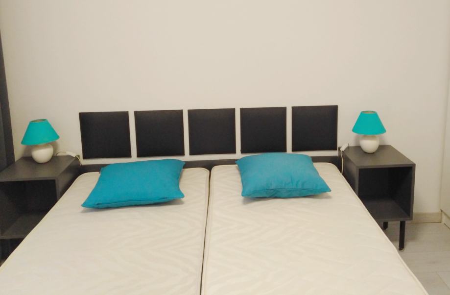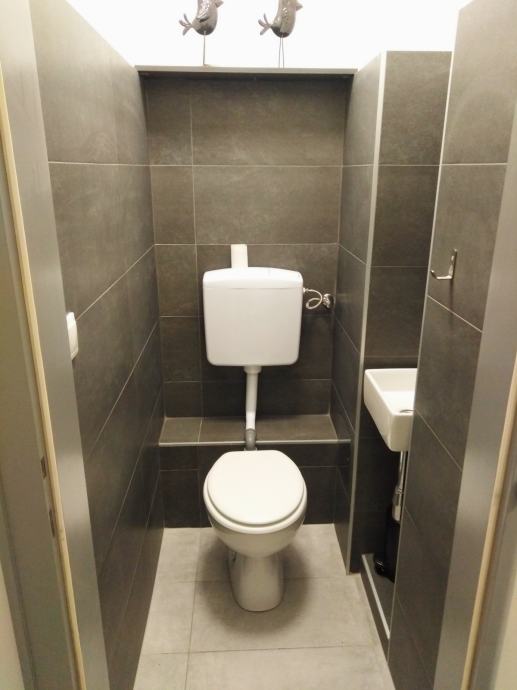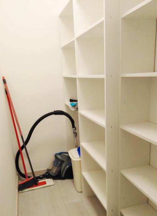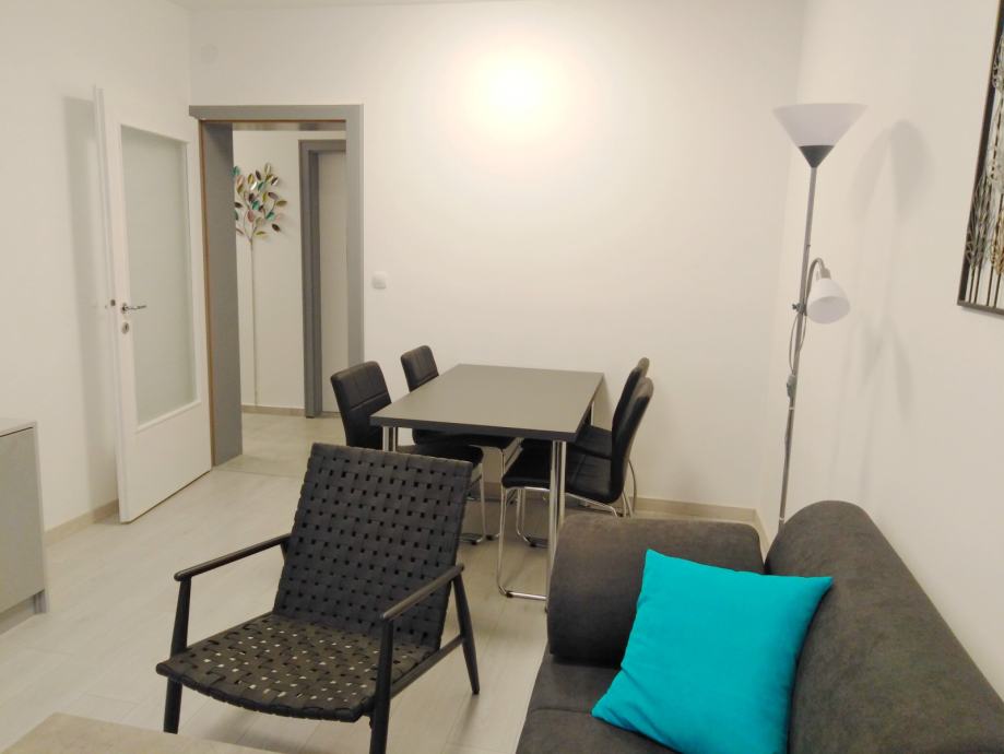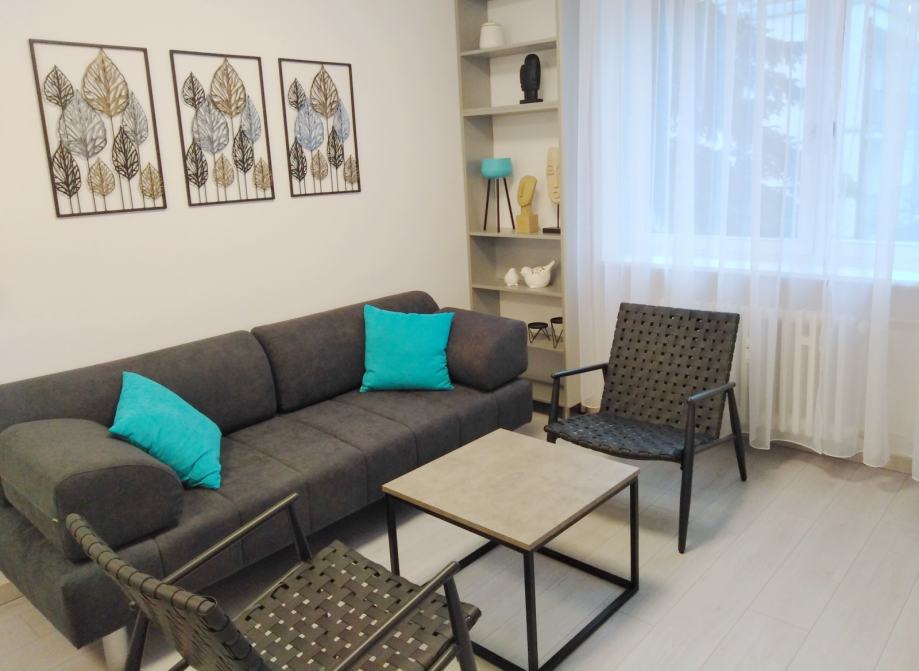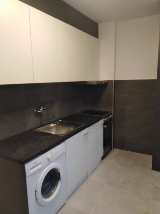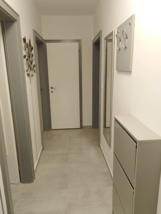Novouređeni dvosobni stan, moderan i komforan, s namještajem i opremom (perilica rublja, perilica posuđa, frižider, štednjak. mikrovalna, klima). Stan se sastoji od dnevnog boravka s blagovaonicom, spavaće sobe, kuhinje, kupaonice, zasebnog wc-a, ulaznog halla i gospodarske prostorije.