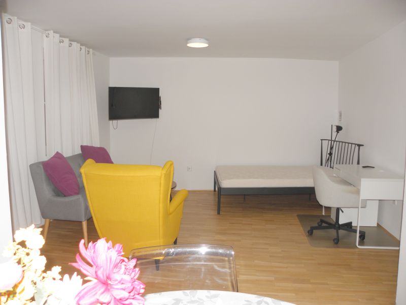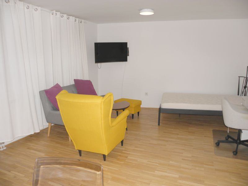 U DNEVNOM BORAVKU je novi TV Samsung 43" zakrivljeni 4K Crystal Colour UHD Smart Serija 6 i nova art fotelja s osloncem/odmorištem za noge, prostrani krevet, te radni stol s pripadajućom daktilo-stolicom.