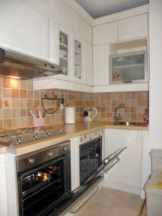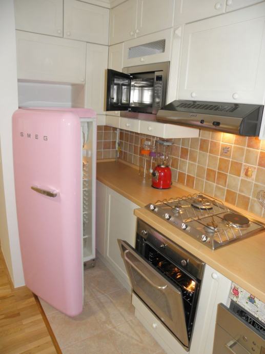 KUHINJA- kompletno namještena i opremljena potrebitim uređajima (hladnjak s ledenicom, ugradbena i mikrovalna pećnica, perilica posuđa, napa, te kompleti čaša i posuđa.