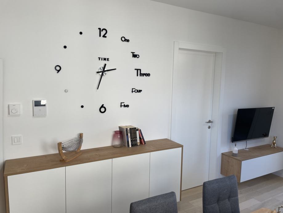 Stan je potpuno opremljen namještajem koji je izrađen po mjeri i novim kvalitetnim kucanskim aparatima A+ razreda.