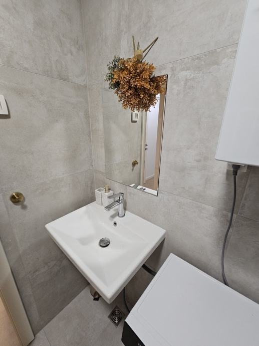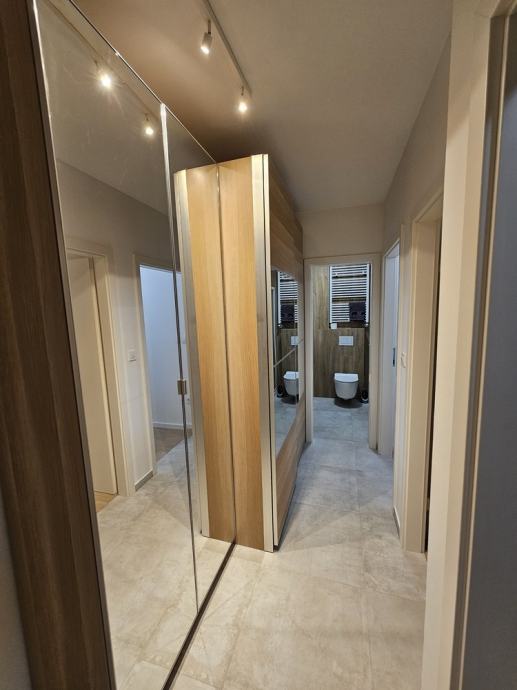 Raspored: veliki dnevni boravak + blagovaona i kuhinja, 2 zasebne prostrane spavaće sobe, kupaonica s wc-om, umivaonikom i tušom te još jedan posebno odvojeni wc sa umivaonikom.
