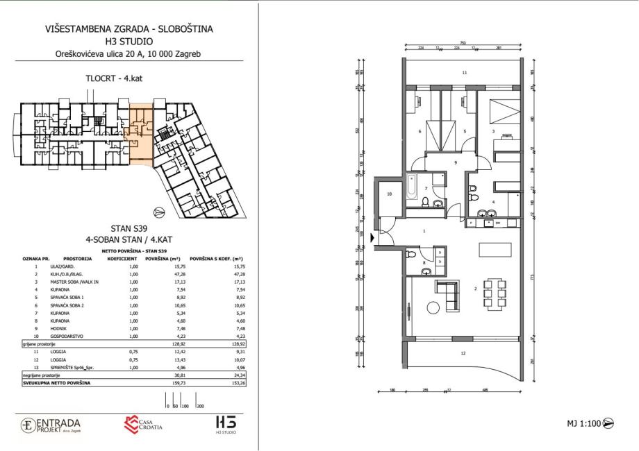 Prodaje se četverosoban stan S39 obračunske površine 153,26 m2 u Oreškovićevoj ulici 20A u projektu u izgradnji s ukupno 86 stanova na 4. katu, orijentiran prema istoku i zapadu, a koji se sastoji od ulaznog hodnika, dnevnog boravka s kuhinjom i blagovaonicom, tri spavaće sobe, dvije kupaonice s WC-om, ostave, dvije loggije i spremišta u hodniku.