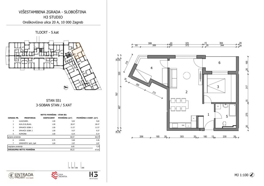 Prodaje se trosoban stan S51 obračunske površine 67,81 m2 u Oreškovićevoj ulici 20A u projektu u izgradnji s ukupno 86 stanova na 5. katu, orijentiran prema sjeverozapadu, a koji se sastoji od ulaznog hodnika, dnevnog boravka s kuhinjom i blagovaonicom, dvije spavaće sobe, kupaonice s WC-om, loggije i spremišta u hodniku.