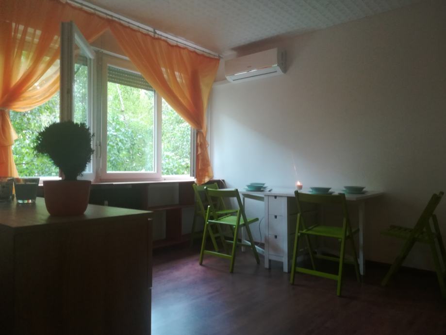 Stan se nalazi u zgradi na drugom katu (s liftom), potpuno namješten (ima i perilicu posuđa i skroz novu mikrovalku) , sastoji se od prostrane sobe, kuhinje, kupaonice i hodnika.