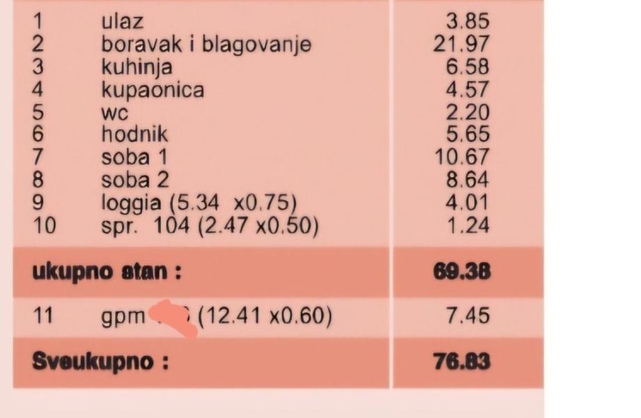 Prodaje se svijetao stan obračunske površine 77 m² na 5. katu zgrade s dva lifta (2016.). Stan je jugozapadne orijentacije i sve prostorije imaju prozore. Sastoji se od ulaznog hodnika, kuhinje, dnevnog boravka s blagavaonicom, dvije spavaće sobe, kupaonice, dodatnog WC-a, loggie, spremišta i garažnog parkirnog mjesta.