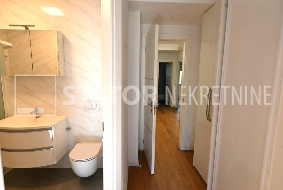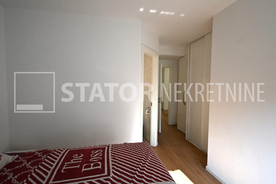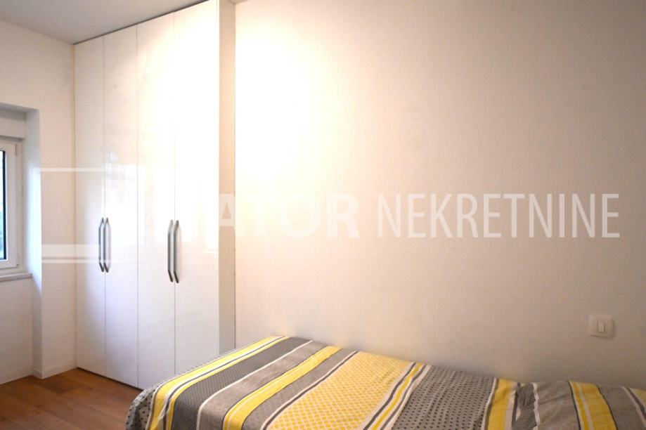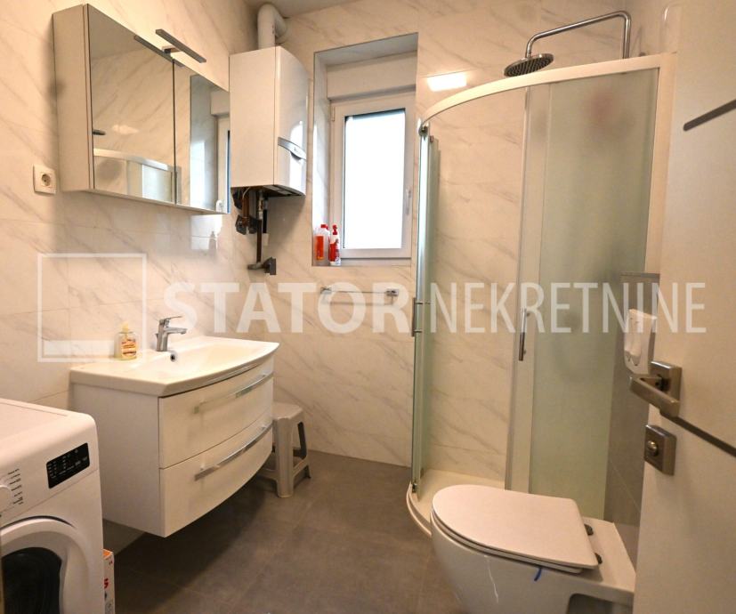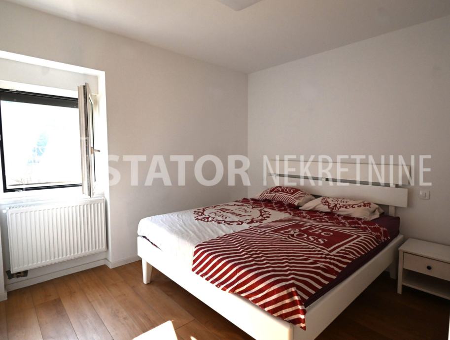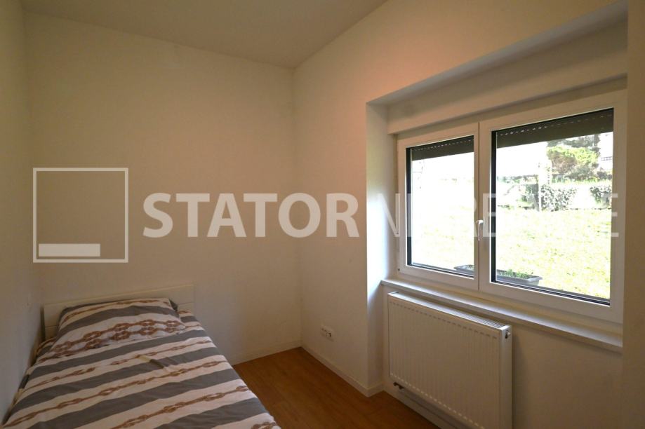 ZELENGAJ, iznajmljuje se četverosobni, uredo održavan stan u prizemlju zgrade reprezentativnog ulaza. Sastoji se od hodnika u kojem su i ugradbeni ormari. Desno od ulaza nalazi se dnevni boravak u sklopu kojeg je i kuhinja sa blagovaonicom, sve okrenuto na uličnu stranu. Lijevo od ulaza su tri spavaće sobe i dvije kupaonice. Roditeljska, veća spavaća soba namještena je sa bračnim krevetom i ormarima ima i vlastitu kupaonicu sa WC – om. Dvije manje sobe opremljene su sa krevetima za jedu osobu i također sa ormarima. Pored soba je druga kupaonica. Kuhinja je također u potpunosti namještena i opremljena, elementi i kuhinjski otok rađeni po mjeri, perilica posuđa i veliki hladnjak sa škrinjom za zamrzavanje. Dnevni prostor sa udubnom garniturom u L, police za odlaganje i TV, prostor za blagovanje sa stolom i 8 stolica. U jednoj od kupaonica je perilica rublja. Grijanje je etažno, plinsko, klima. U prizemlju lijevo od ulaza nalazi se ostava za bicikle, skije, kutije ili jednostavno prostor za odlaganje. S OBZIROM NA POLOŽAJ I OTVORENOST VRTA KOJI OKRUŽUJE ZGRADU STAN JE SVIJETAO I UGODAN ZA STANOVANJE. NA SAMO NEKOLIKO MINUTA JE BRUTANAC, TRŽNICA, PREKO PUTA ZGRADE PARK I ŠUMA, AUTOBUSNA STANICA…MIRNO I TIHO OKRUŽENJE!!! PREPORUKA!!!