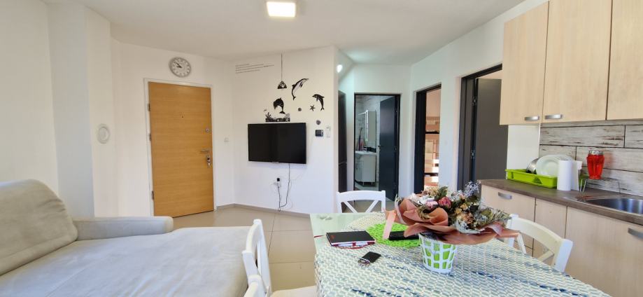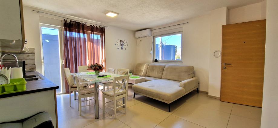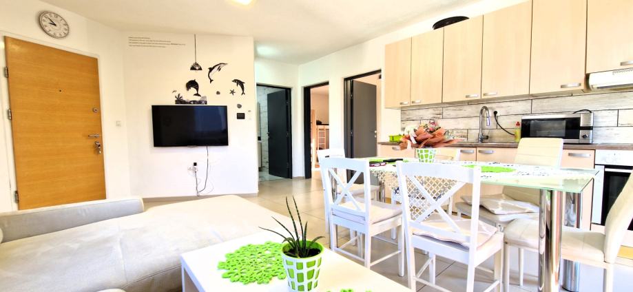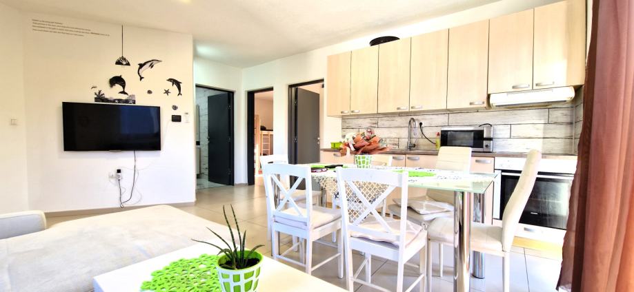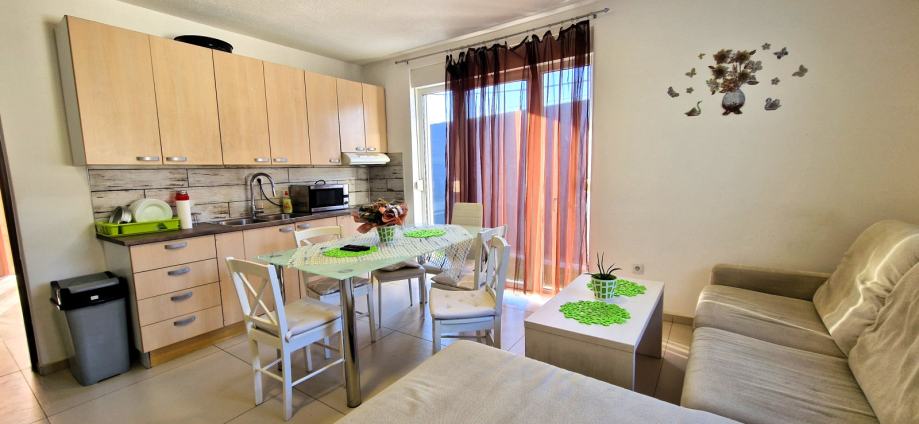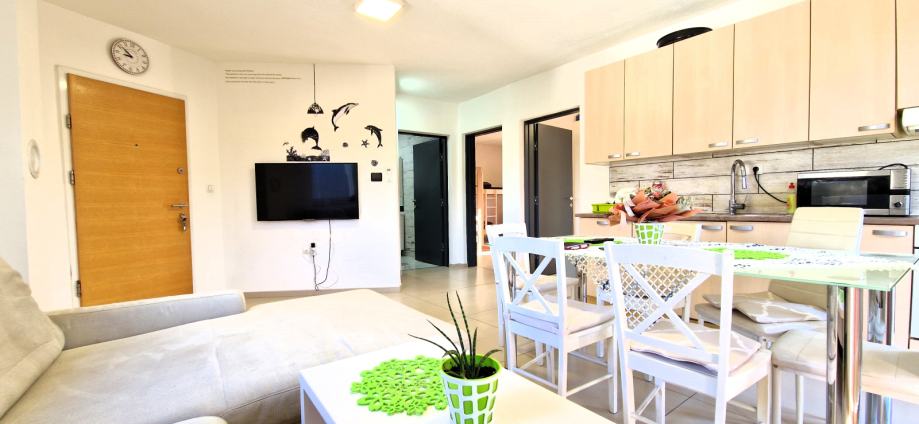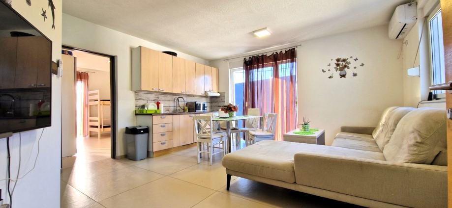 Stan se sastoji od ulaznog hodnika, kupaonice s tuš kadom i WC-om, dvije velike spavaće sobe u kojima su smještena po dva kreveta na kat i veliki ugradbeni ormari, velikog dnevnog boravka s blagovaonskim stolom i TV-om, te kuhinjom. Stan je kompletno opremljen i uređen.