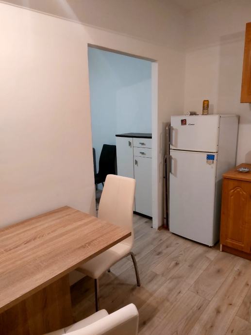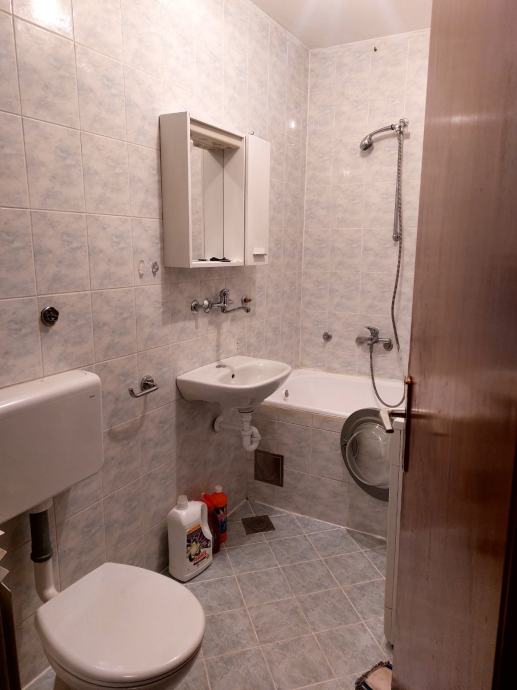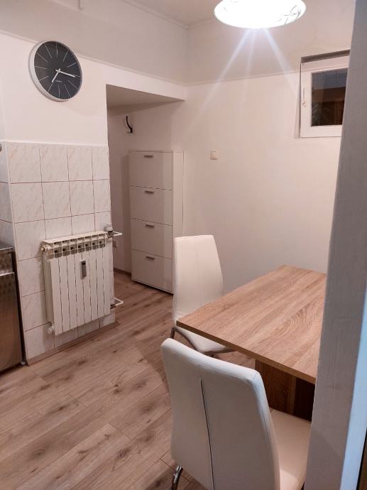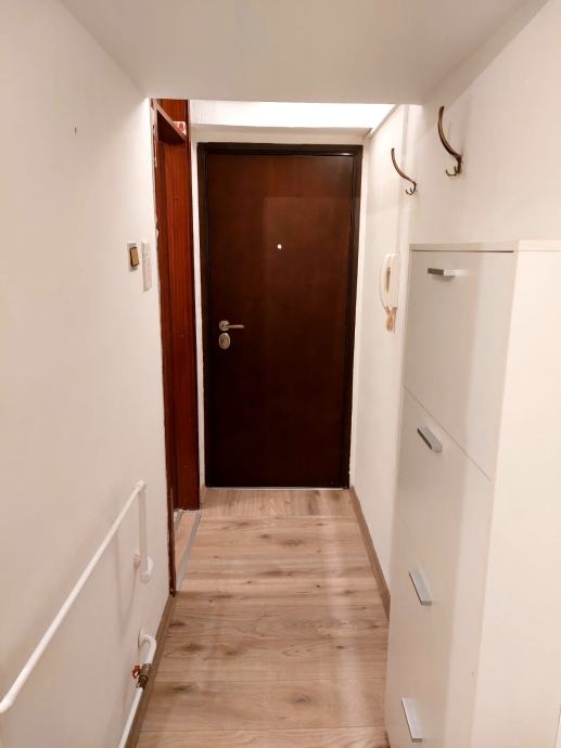 Stan je potpuno namješten i spreman za useljenje. U prostoru se nalazi blagovaonski stol s stolicama, hladnjak i kuhinjski elementi, a hodnik ima praktičan ormarić za obuću. Kupaonica ima kadu i jedan WC te perilicu za rublje. Na ulazu su ugrađena protuprovalna vrata.