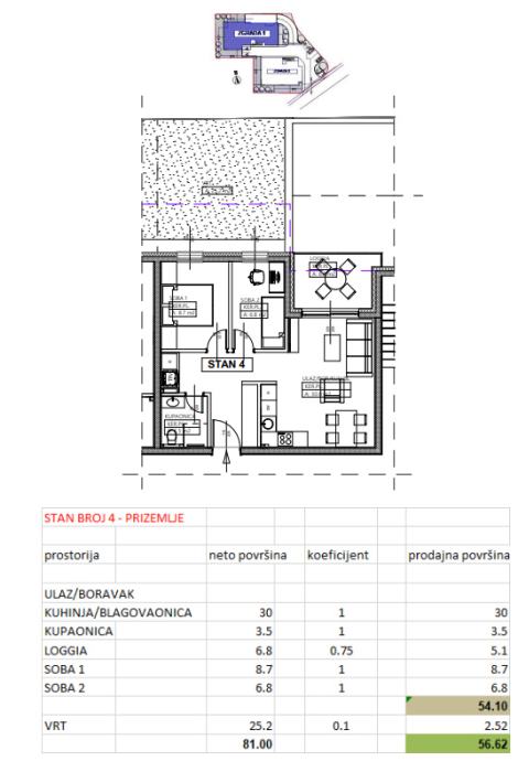 Stan S4 prodaje se u sklopu projekta stambene građevine Zaprešić. Smješten je u prizemlju zgrade 1 te se sastoji od ulaza/boravka, kuhinje/blagovaone, kupaonice, loggie, dvije spavaće sobe i vrta.