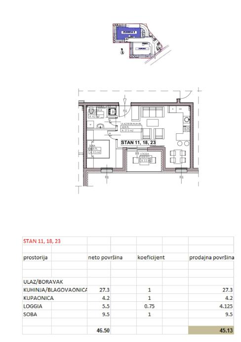 Stan S11 prodaje se u sklopu projekta stambene građevine Zaprešić. Smješten je na prvom katu zgrade 1 te se sastoji od ulaza/boravka/kuhinje/blagovaone, kupaonice, loggie i spavaće sobe.
