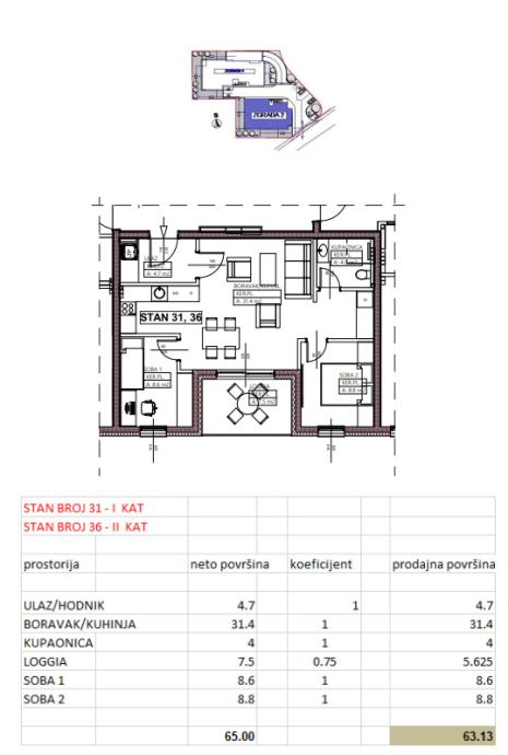 Stan S36 prodaje se u sklopu projekta stambene građevine Zaprešić. Smješten je na drugom katu zgrade 2 te se sastoji od ulaza/boravka, kuhinje/blagovaone, kupaonice, loggie i dvije spavaće sobe.