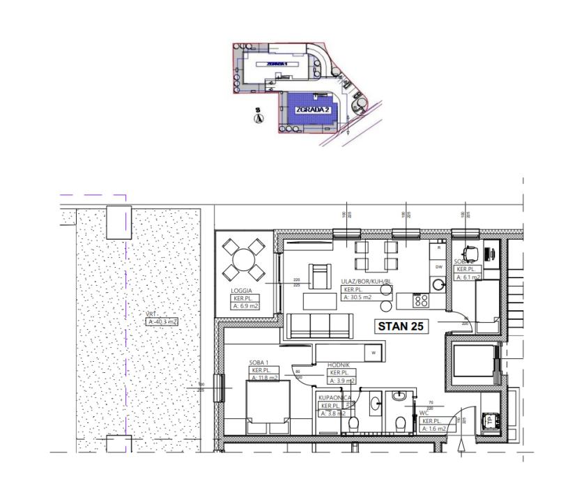 Stan S25 prodaje se u sklopu projekta stambene građevine Zaprešić. Smješten je u prizemlju zgrade 2 te se sastoji od ulaza/hodnika/boravka/kuhinje, kupaonice, wc-a, loggie, dvije spavaće sobe i vrta.